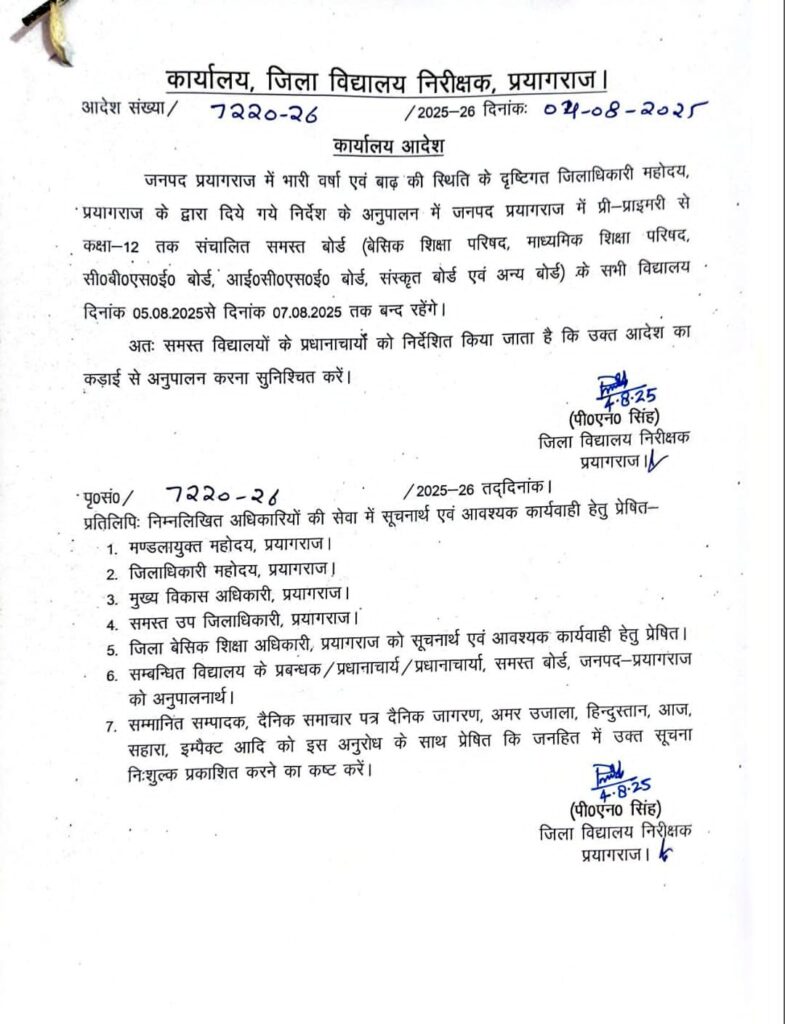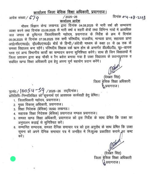 अत्यधिक वर्षा के कारण दिनांक 5 अगस्त से 7 अगस्त 2025 तक कक्षा 1 से 8 तक के परिषदीय विद्यालयों में अवकाश रहेगा।