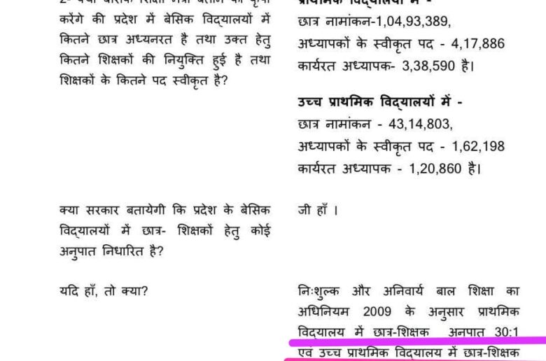 👉प्राथमिक विद्यालय: छात्र नामांकन= 1,04,93,389 अध्यापकों के स्वीकृत पद= 4,17,886 कार्यरत अध्यापक= 3,38,590 अध्यापकों के रिक्त पद= 79,296 👉उच्च प्राथमिक विद्यालय: छात्र नामांकन= 43,14,803 अध्यापकों के स्वीकृत पद= 1,62,198 कार्यरत … Continue reading अनुपात समानुपात एक बार पुनः बराबर है सदन में बताते बेसिक शिक्षा मंत्री