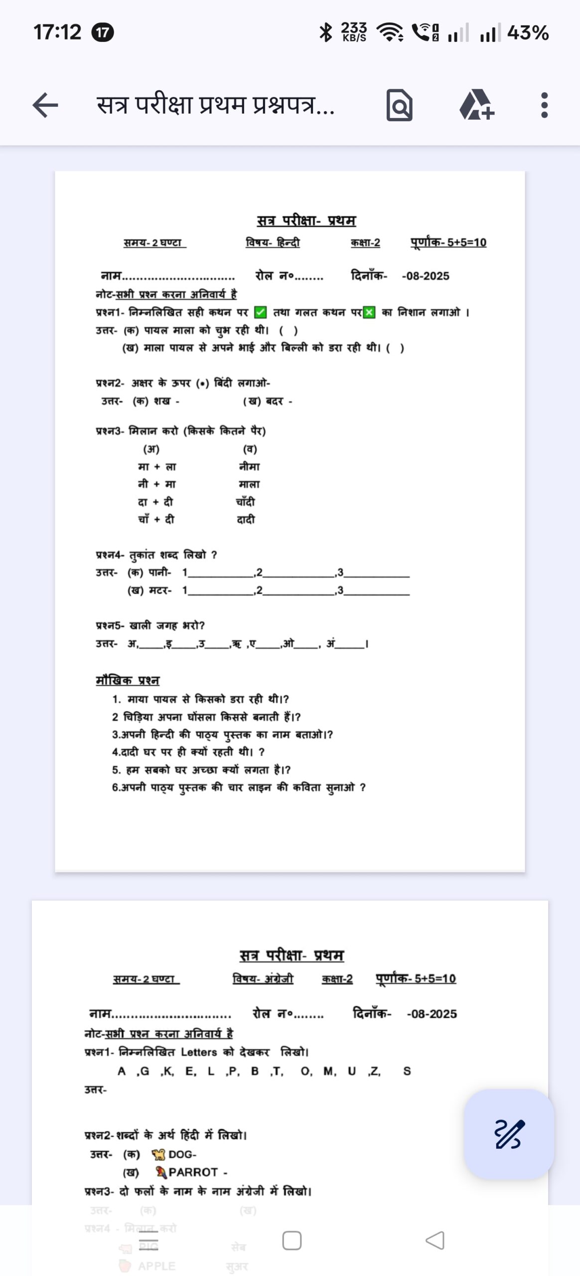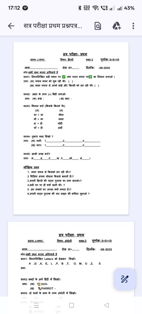 प्रथम सत्र परीक्षा 2025 नमूना प्रश्न पत्र