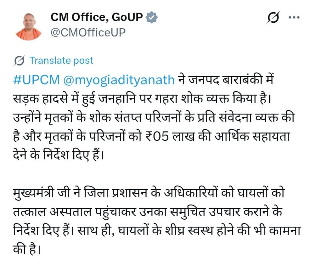घटना पर मुख्यमंत्री योगी आदित्यनाथ ने गहरा शोक व्यक्त किया है। उन्होंने मृतकों के शोक संतप्त परिजनों के प्रति संवेदना व्यक्त की है और मृतकों के परिजनों को ₹5 लाख की आर्थिक सहायता देने के निर्देश दिए हैं। मुख्यमंत्री जी ने जिला प्रशासन के अधिकारियों को घायलों को तत्काल अस्पताल पहुंचाकर उनका समुचित उपचार कराने के निर्देश दिए हैं। साथ ही, घायलों के शीघ्र स्वस्थ होने की भी कामना की है।