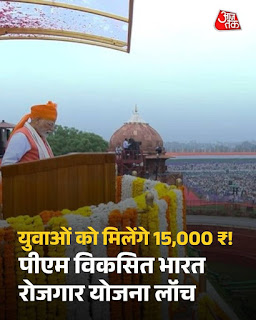 पीएम मोदी ने लालकिले से कहा कि 15 अगस्त से ये योजना शुरू कर रहे हैं. आज से प्रधानमंत्री विकसित भारत रोजगार योजना आज से लागू हो रही है. इस योजना के तहत निजी क्षेत्र में पहली नौकरी पाने वाले बच्चों को 15000 रुपये सरकार की ओर से दिए जाएंगे. जो कंपनियां ज्यादा रोजगार देने के लिए प्रयास करेंगे, उन्हें भी प्रोत्साहन राशि दी जाएगी. प्रधानमंत्री विकसित भारत रोजगार योजना करीब-करीब साढ़े 3 करोड़ नौजवानों को रोजगार के नए अवसर प्रदान करेगी।