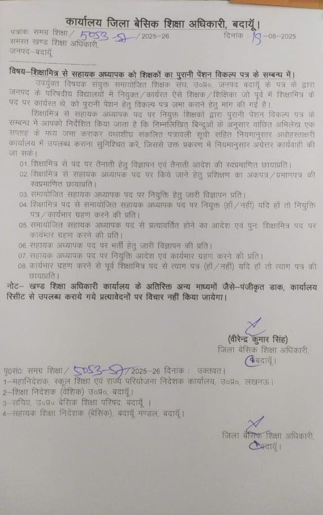 शिक्षामित्र से सहायक अध्यापक पद पर नियुक्त शिक्षकों द्वारा पुरानी पेंशन विकल्प पत्र के सम्बन्ध में आपको निर्देशित किया जाता है कि निम्नलिखित् बिन्दुओं के अनुसार यांछित अभिलेख एक सप्ताह के मध्य जमा कराकर यथाशीघ्र संकलित पत्रावली सूची सहित नियमानुसार अधोहस्ताक्षरी कार्यालय में उपलब्ध कराना सुनिश्चित करें, जिससे उक्त प्रकरण में नियमानुसार अग्रेत्तर कार्यवाही की जा सके।