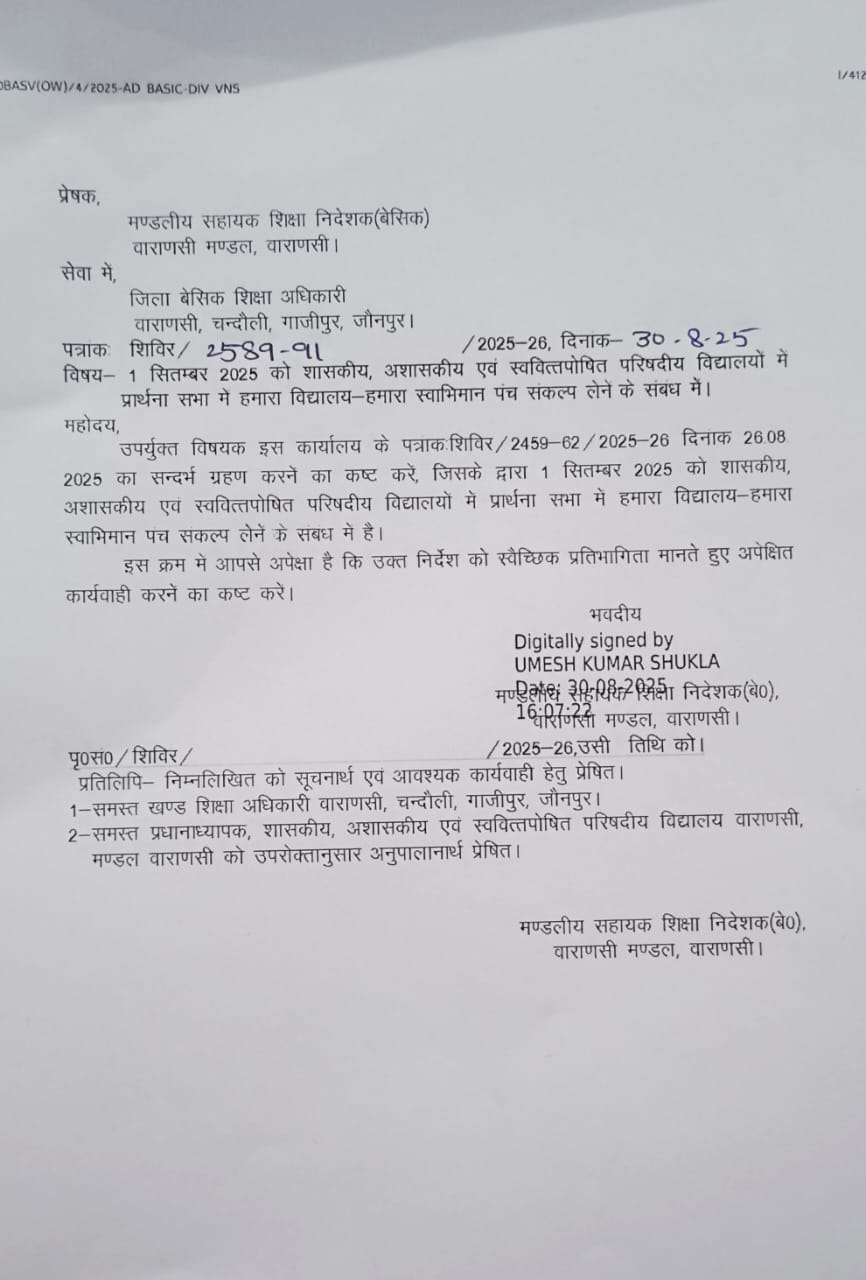 1 सितम्बर 2025 को शासकीय, अशासकीय एवं स्ववित्तपोषित परिषदीय विद्यालयों में प्रार्थना सभा में हमारा विद्यालय-हमारा स्वाभिमान पंच संकल्प लेने के संबंध में।