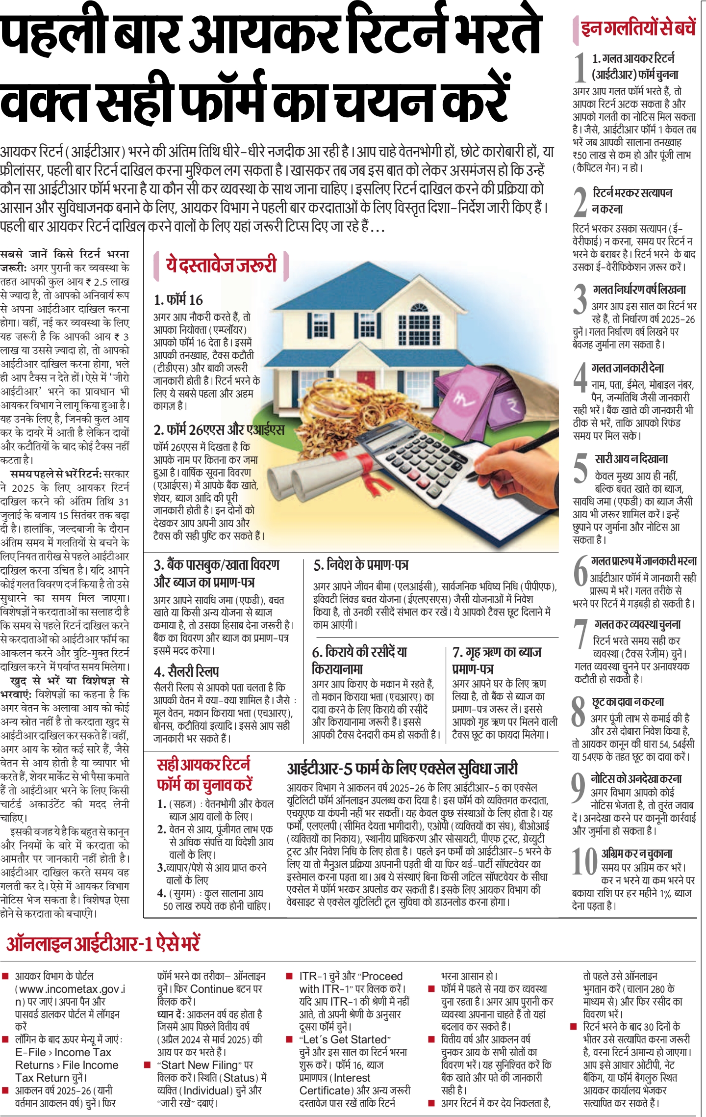 आयकर रिटर्न (आईटीआर) भरने की अंतिम तिथि धीरे-धीरे नजदीक आ रही है। आप चाहे वेतनभोगी हों, छोटे कारोबारी हों, या फ्रीलांसर, पहली बार रिटर्न दाखिल करना मुश्किल लग सकता है। खासकर तब जब इस बात को लेकर असमंजस हो कि उन्हें कौन सा आईटीआर फॉर्म भरना है या कौन सी कर व्यवस्था के साथ जाना चाहिए। इसलिए रिटर्न दाखिल करने की प्रक्रिया को आसान और सुविधाजनक बनाने के लिए, आयकर विभाग ने पहली बार करदाताओं के लिए विस्तृत दिशा-निर्देश जारी किए हैं। पहली बार आयकर रिटर्न दाखिल करने वालों के लिए यहां जरूरी टिप्स दिए जा रहे हैं…