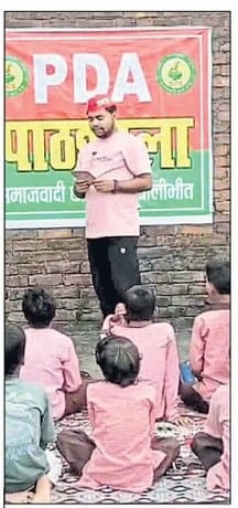 पीडीए पाठशाला का पोस्टर लगा पढ़ाते नजर आए सपा नेता