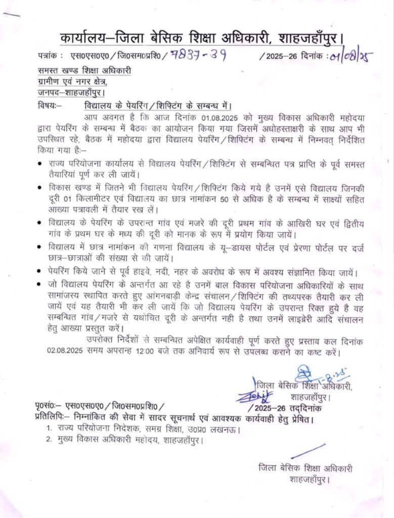 विद्यालय पेयरिंग के संबंध में बीएसए का आदेश