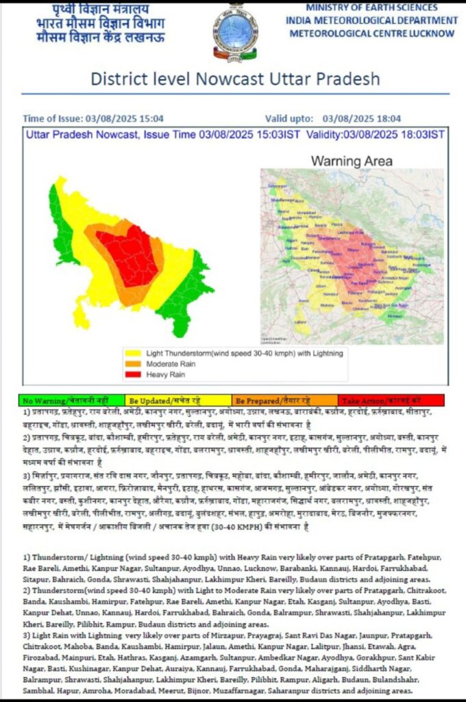 1) प्रतापगढ़, फतेहपुर, राय बरेली, अमेठी, कानपुर नगर, सुल्तानपुर, अयोध्या, उन्नाव, लखनऊ, बाराबंकी, कन्नौज, हरदोई, फर्रुखाबाद, सीतापुर, बहराइच, गोंडा, श्रावस्ती, शाहजहाँपुर, लखीमपुर खीरी, बरेली, बदायूं, में भारी वर्षा की संभावना है