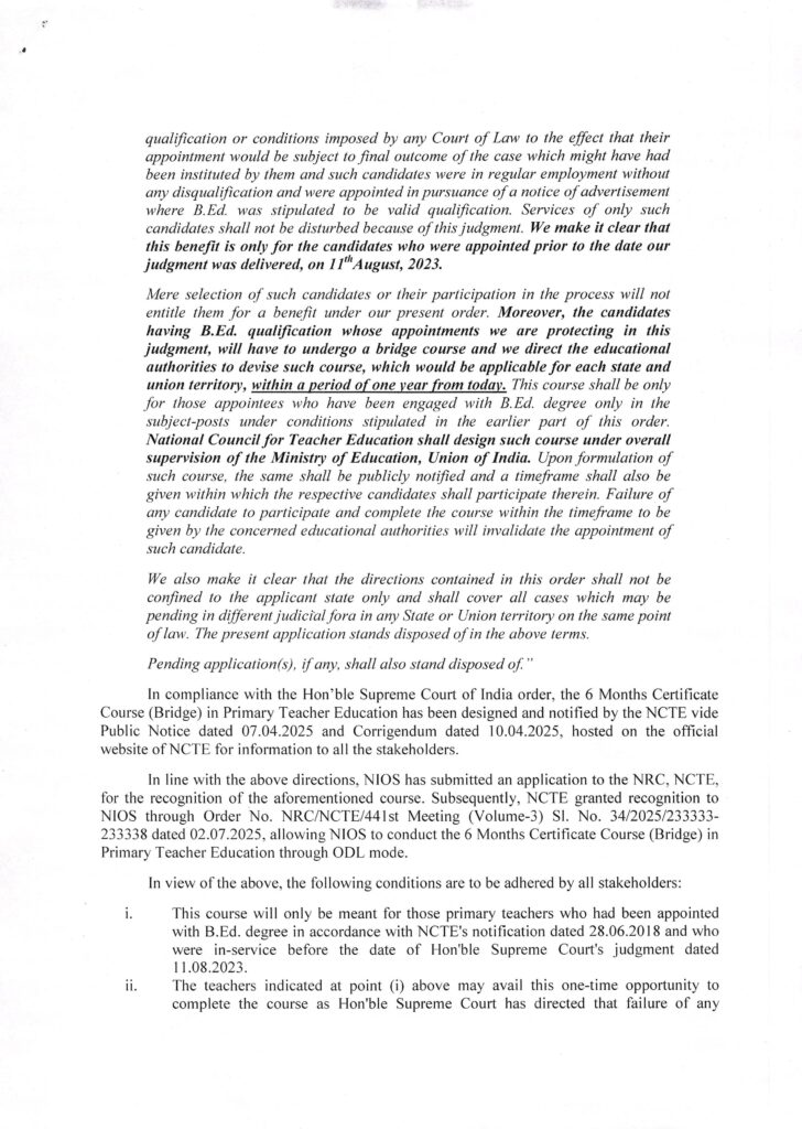 (i) *यह पाठ्यक्रम केवल उन प्राथमिक शिक्षकों के लिए होगा, जिन्हें एनसीटीई की अधिसूचना दिनांक 28.06.2018 के अनुसार बी.एड. डिग्री के साथ नियुक्त किया गया था और जो माननीय सर्वोच्च न्यायालय के दिनांक 11.08.2023 के निर्णय से पहले सेवा में थे*।