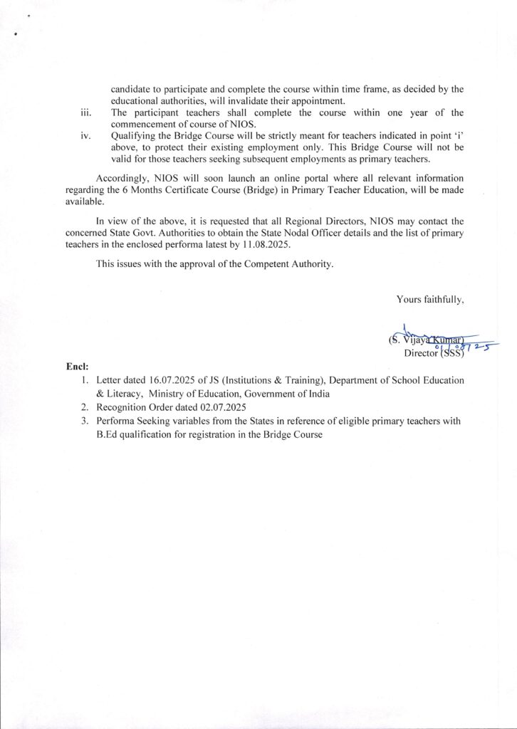 समिति ने निर्णय लिया कि राष्ट्रीय मुक्त विद्यालयी शिक्षा संस्थान (एनआईओएस) को प्राथमिक शिक्षक शिक्षा में 6 माह के प्रमाणपत्र पाठ्यक्रम (ब्रिज) को ओडीएल मोड के माध्यम से संचालित करने के लिए मान्यता दी गई है, निम्नलिखित शर्तों के साथ*: