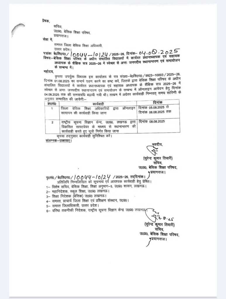 बेसिक शिक्षा परिषद के के अधीन संचालित विद्यालयों में कार्यरत प्रधानाध्यापक अध्यापक के शैक्षिक सत्र 2025-26 में स्वेच्छा से अन्तः जनपदीय स्थानान्तरण एवं समायोजन के सम्बन्ध में।