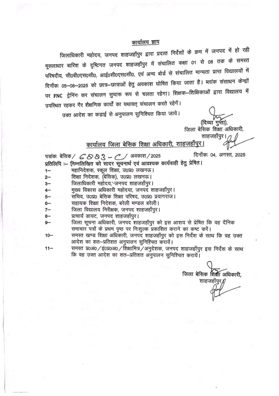 शाहजहांपुर में बच्चों के लिए कल का अवकाश घोषित शिक्षकों के लिए नही✅
