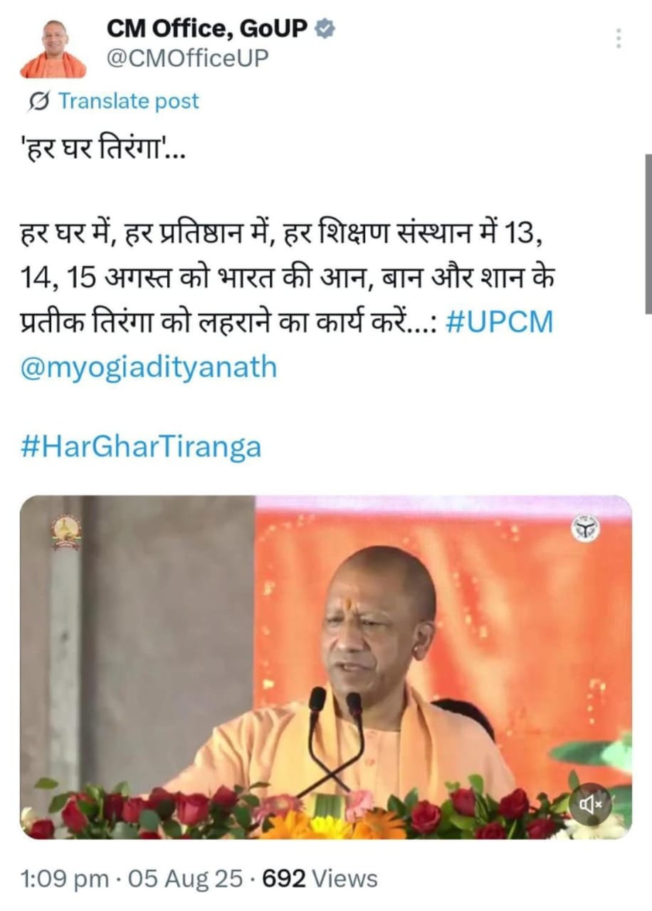 हर घर में, हर प्रतिष्ठान में, हर शिक्षण संस्थान में 13, 14, 15 अगस्त को भारत की आन, बान और शान के प्रतीक तिरंगा को लहराने का कार्य करें…: #UPCM