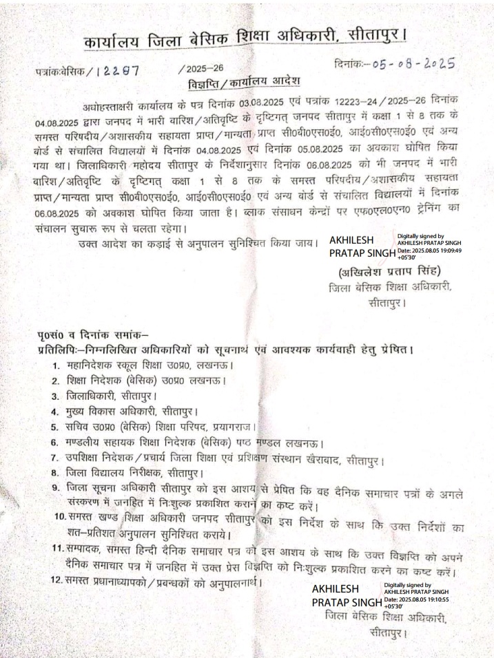 Home HOLIDAY जनपद में 6 अगस्त को रहेगा अतिवृष्टि अवकाश , आदेश जारी