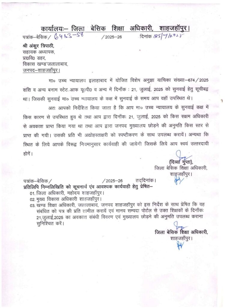 शिक्षकों को बिना अनुमति मुख्यालय त्याग पर स्पष्टीकरण हेतु निर्देश