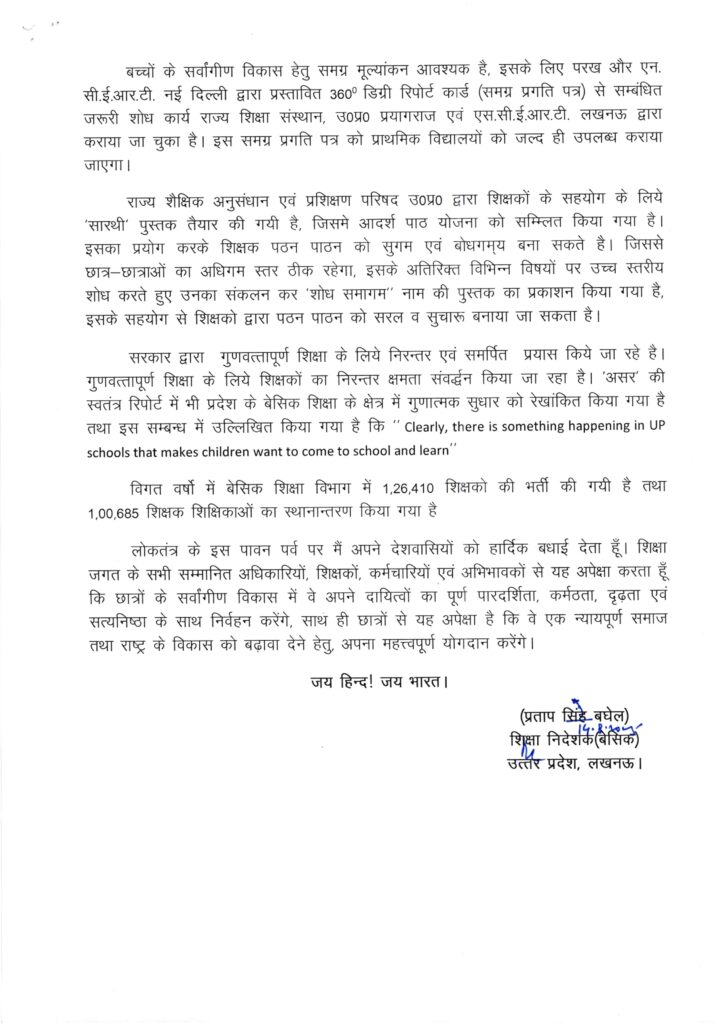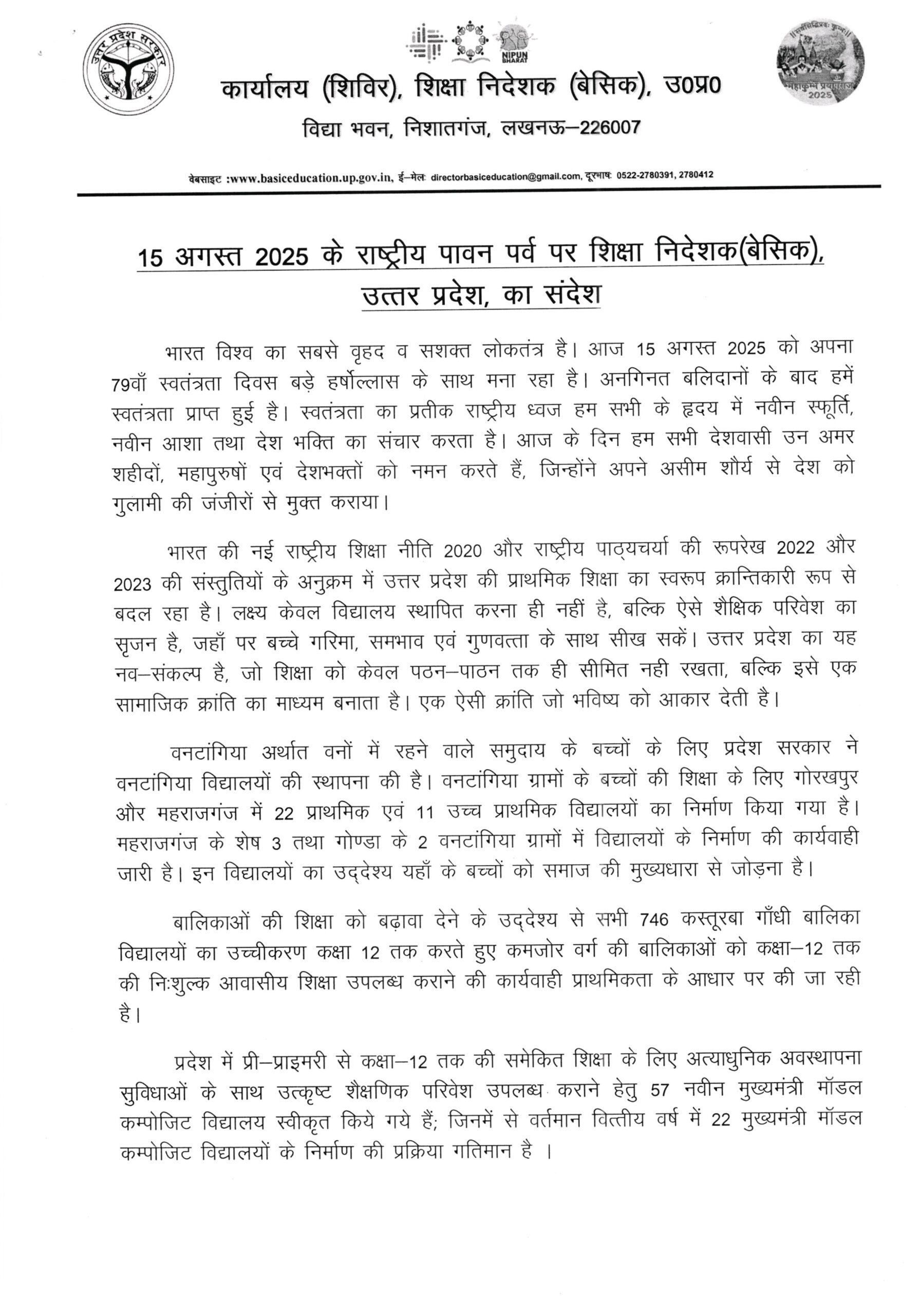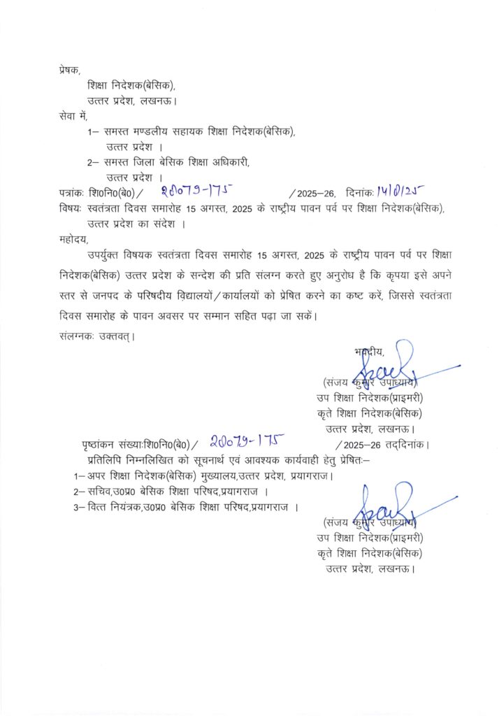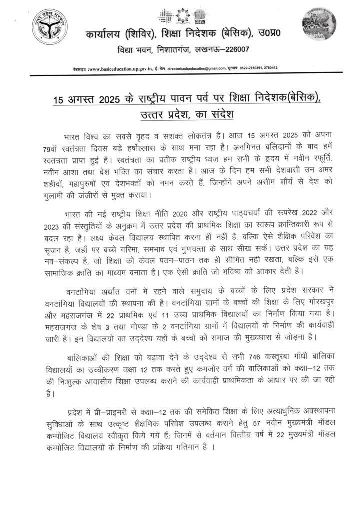 स्वतंत्रता दिवस समारोह 15 अगस्त, 2025 के राष्ट्रीय पावन पर्व पर शिक्षा निदेशक (बेसिक), उत्तर प्रदेश का संदेश