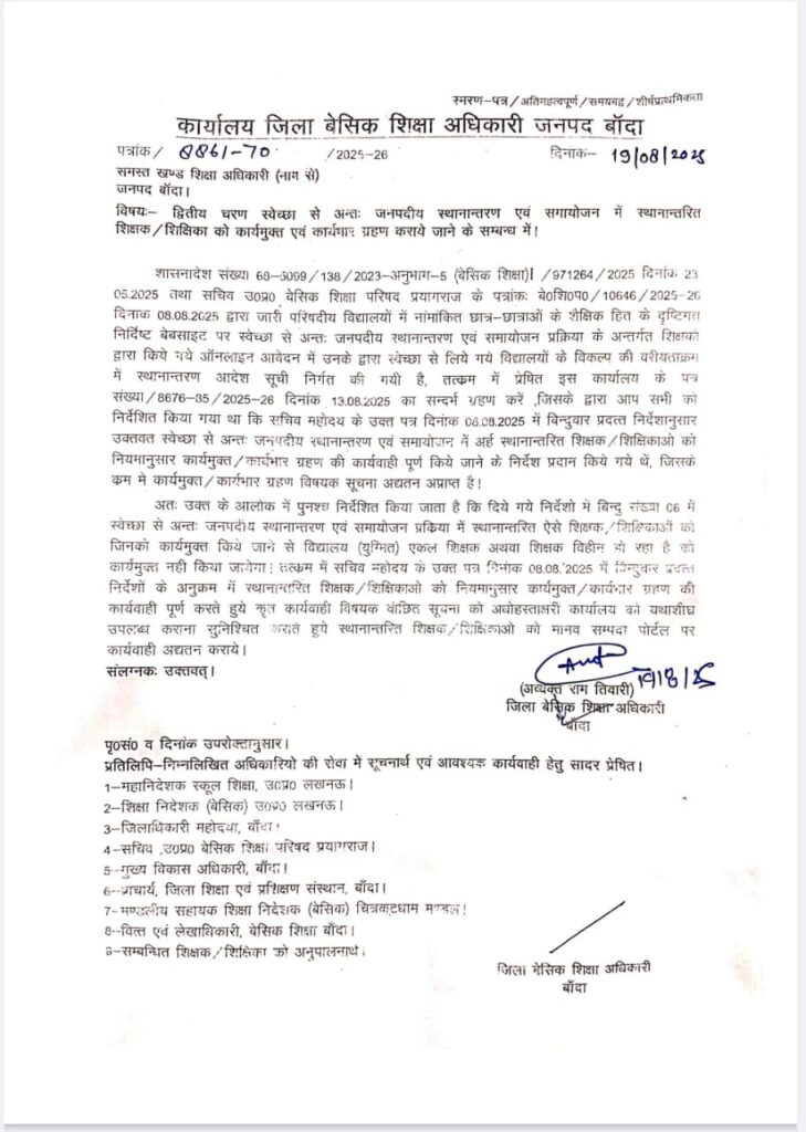 समायोजन 2.0 स्वेच्छा से अंतः जनपदीय स्थानांतरण एवं समायोजन में स्थानान्तरित शिक्षक / शिक्षिका को कार्यमुक्त एवं कार्यभार ग्रहण कराये जाने के संबंध में।