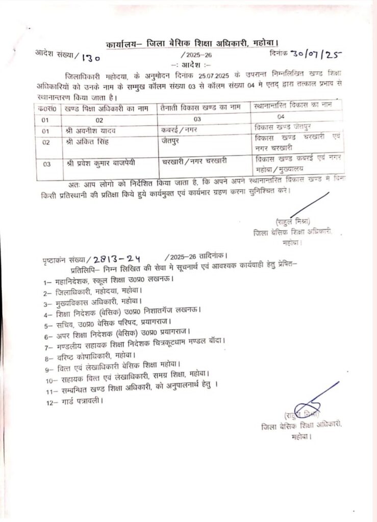 जनपद में खण्ड शिक्षा अधिकारियों के कार्यक्षेत्र बदले