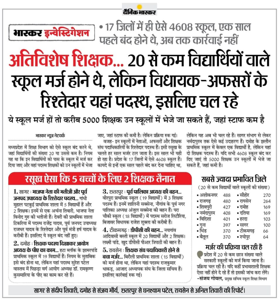 मध्यप्रदेश : 17 जिलों में 4608 स्कूल ऐसे जिन्हें अन्य स्कूल में मर्ज करना था, लेकिन अब तक कार्रवाई नहीं हुई… वजह- विधायक, अफसरों से रिश्तेदार यहां पदस्थ हैं