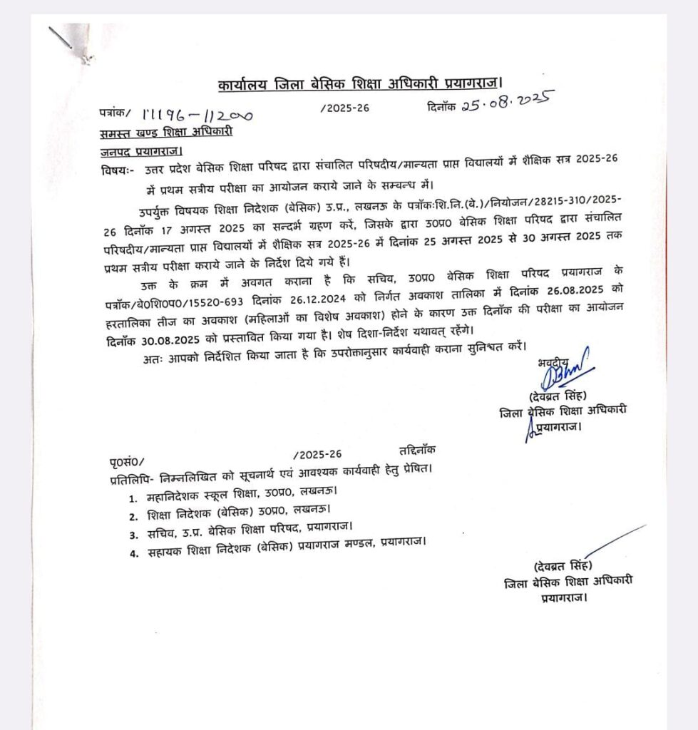 Home HOLIDAY हरतालिका तीज का अवकाश (महिलाओं का विशेष अवकाश) के कारण जनपद में 26 अगस्त की परीक्षा अब 30 अगस्त को