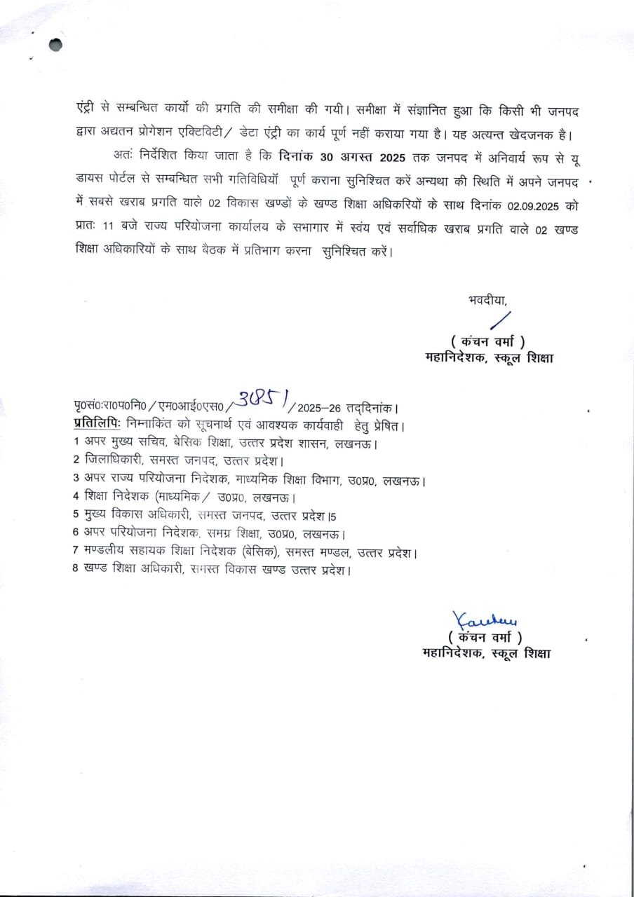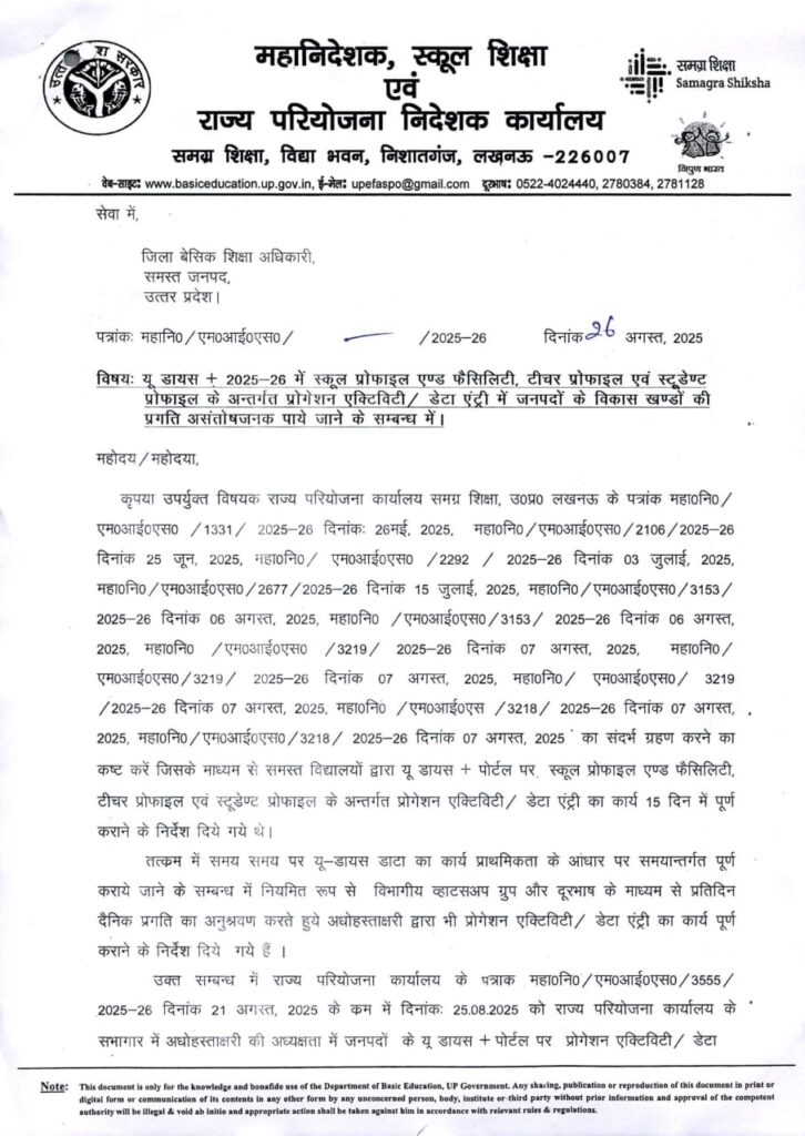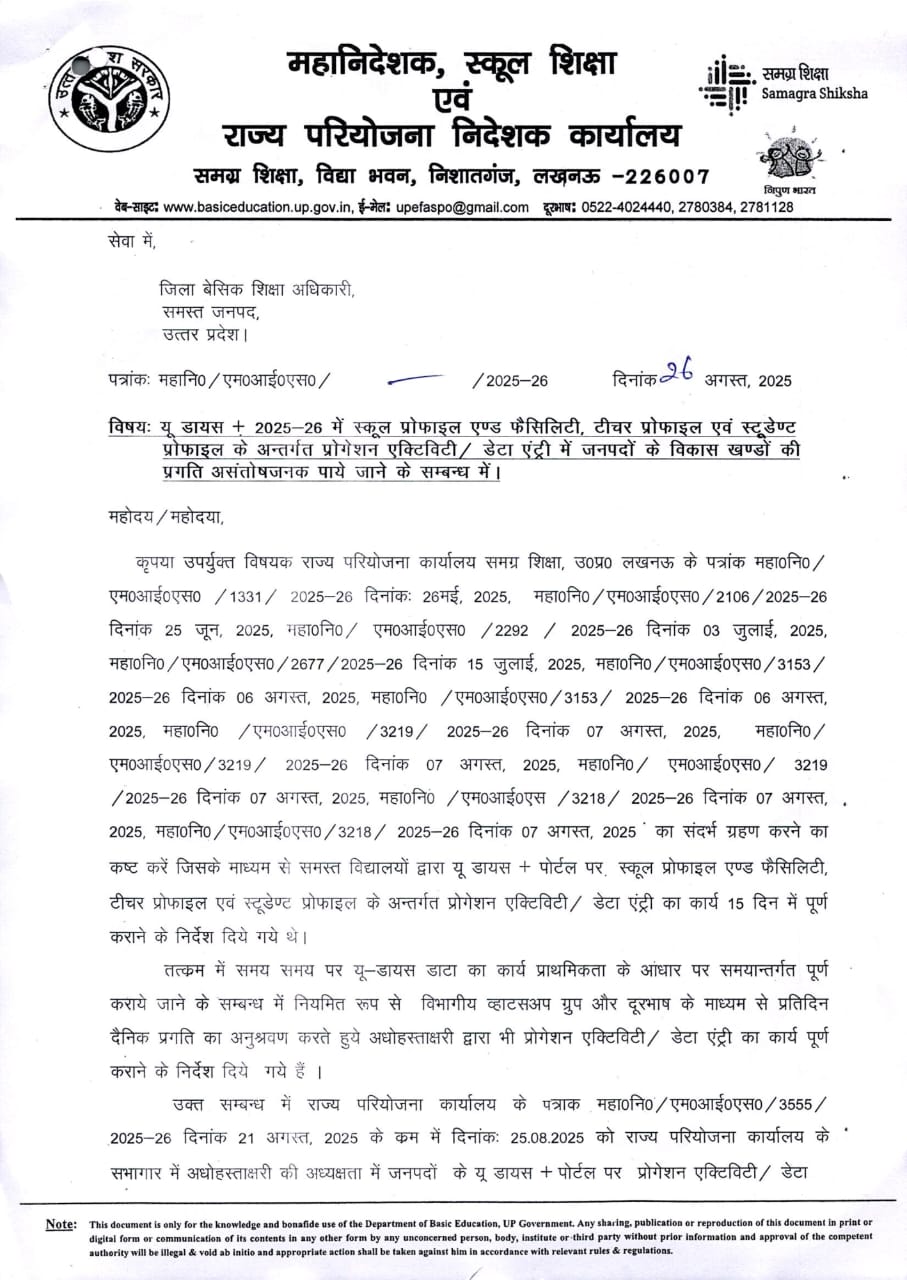 अतःं निर्देशित किया जाता है कि दिनांक 30 अगस्त 2025 तक जनपद में अनिवार्य रूप से यू डायस पोर्टल से सम्बन्धित सभी गतिविधियॉं पूर्ण कराना सुनिश्चित करें अन्यथा की स्थिति में अपने जनपद में सबसे खराब प्रगति वाले 02 विकास खण्डों के खण्ड शिक्षा अधिकरियों के साथ दिनांक 02.09.2025 को प्रातः 11 बजे राज्य परियोजना कार्यालय के सभागार में स्वंय एवं सर्वाधिक खराब प्रगति वाले 02 खण्ड शिक्षा अधिकारियों के साथ बैठक में प्रतिभाग करना सुनिश्चित करें।