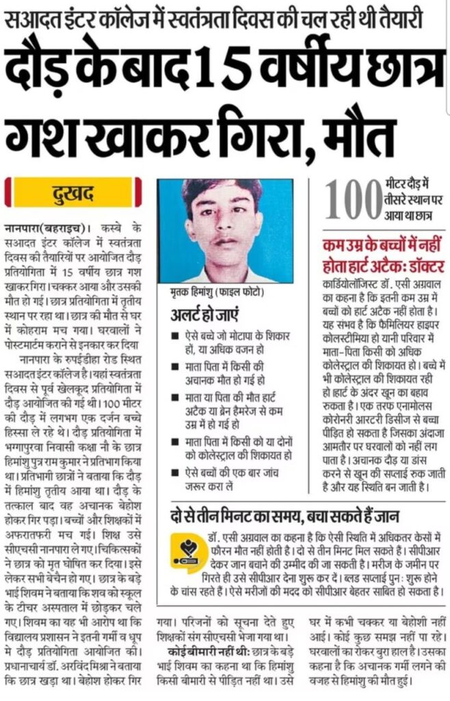 स्कूल में दौड़ के बाद 15 वर्षीय छात्र गश खाकर गिरा, मौत