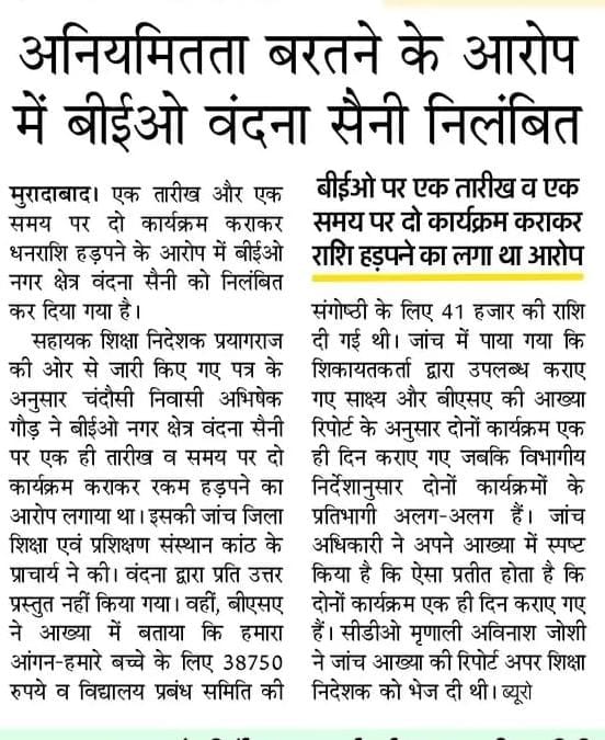 अनियमितता बरतने के आरोप में BEO वंदना सैनी निलंबित