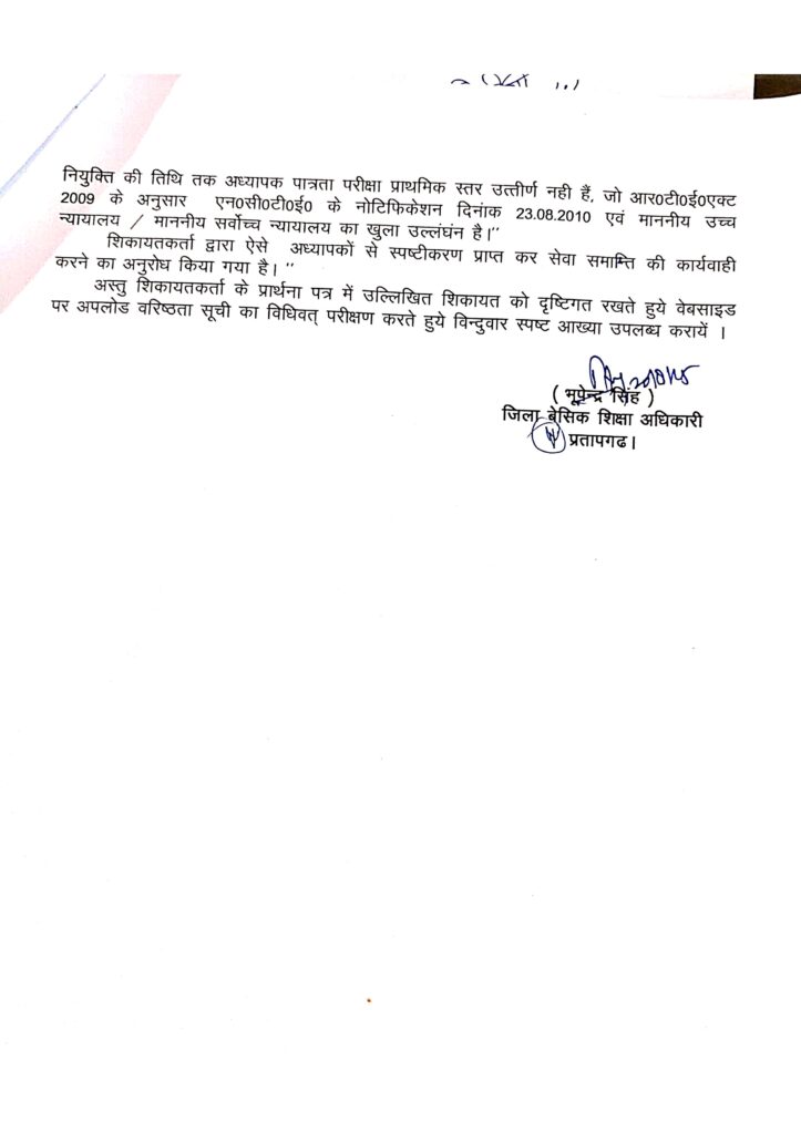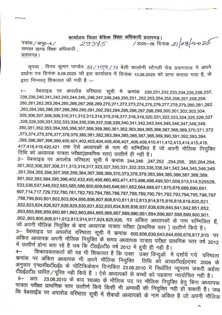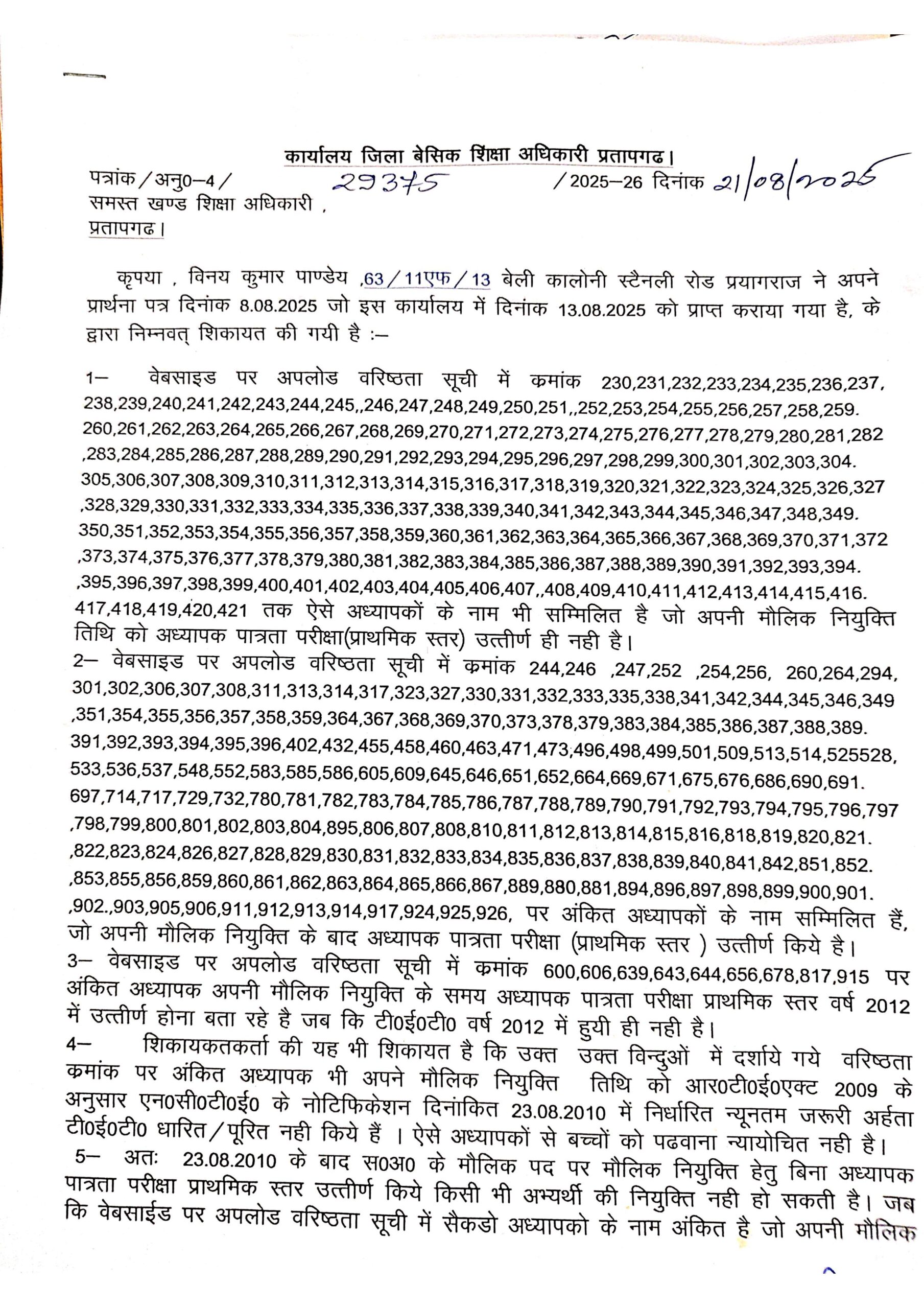 उत्तर प्रदेश बेसिक शिक्षा विभाग में वरिष्ठता सूची संबंधी त्रुटियों तथा अध्यापक पात्रता (TET) अर्हता मामले में शिकायत एवं स्पष्टीकरण की कार्यवाही संबंधी पत्राचार