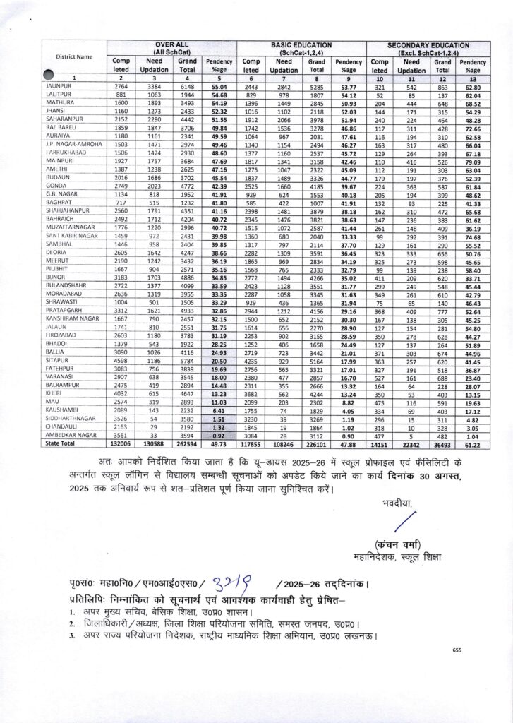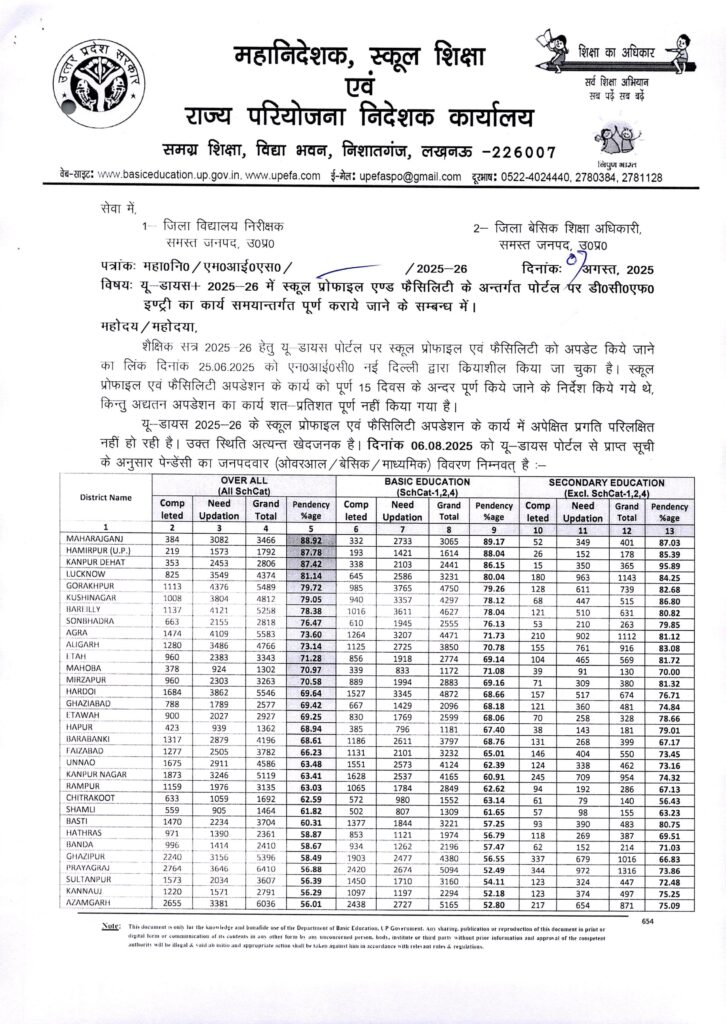 यू-डायस+ 2025-26 में स्कूल प्रोफाइल एण्ड फैसिलिटी के अन्तर्गत पोर्टल पर डी0सी0एफ0 इण्ट्री का कार्य समयान्तर्गत पूर्ण कराये जाने के सम्बन्ध में।