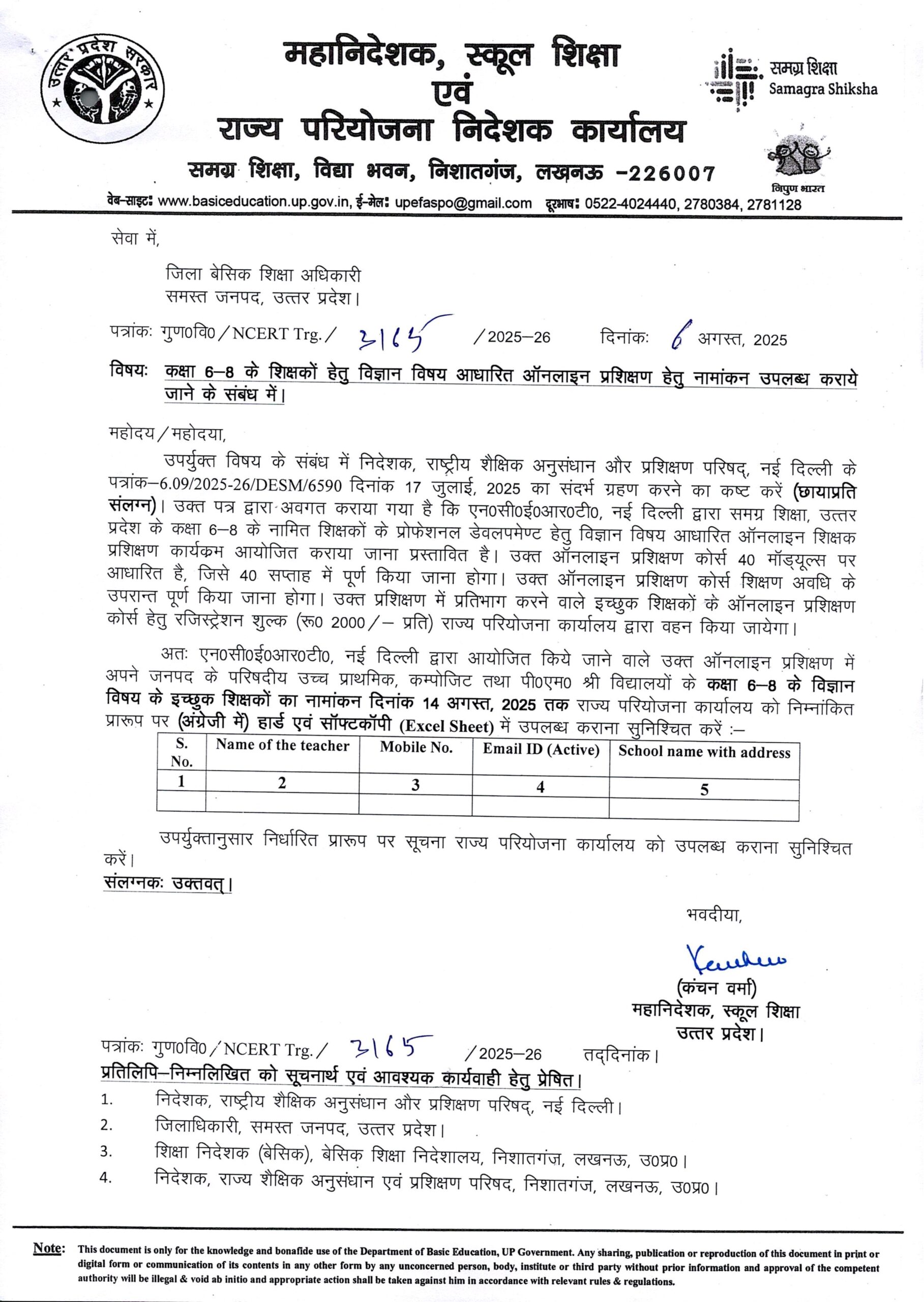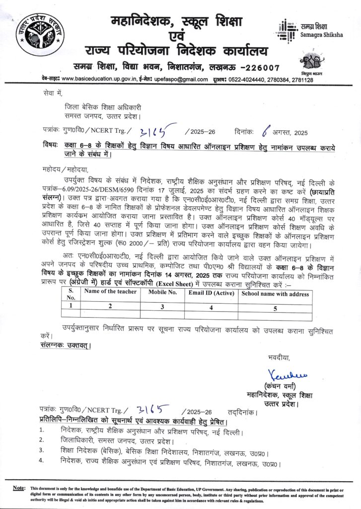 कक्षा 6-8 के शिक्षकों हेतु विज्ञान विषय आधारित ऑनलाइन प्रशिक्षण हेतु नामांकन उपलब्ध कराये जाने के संबंध में।