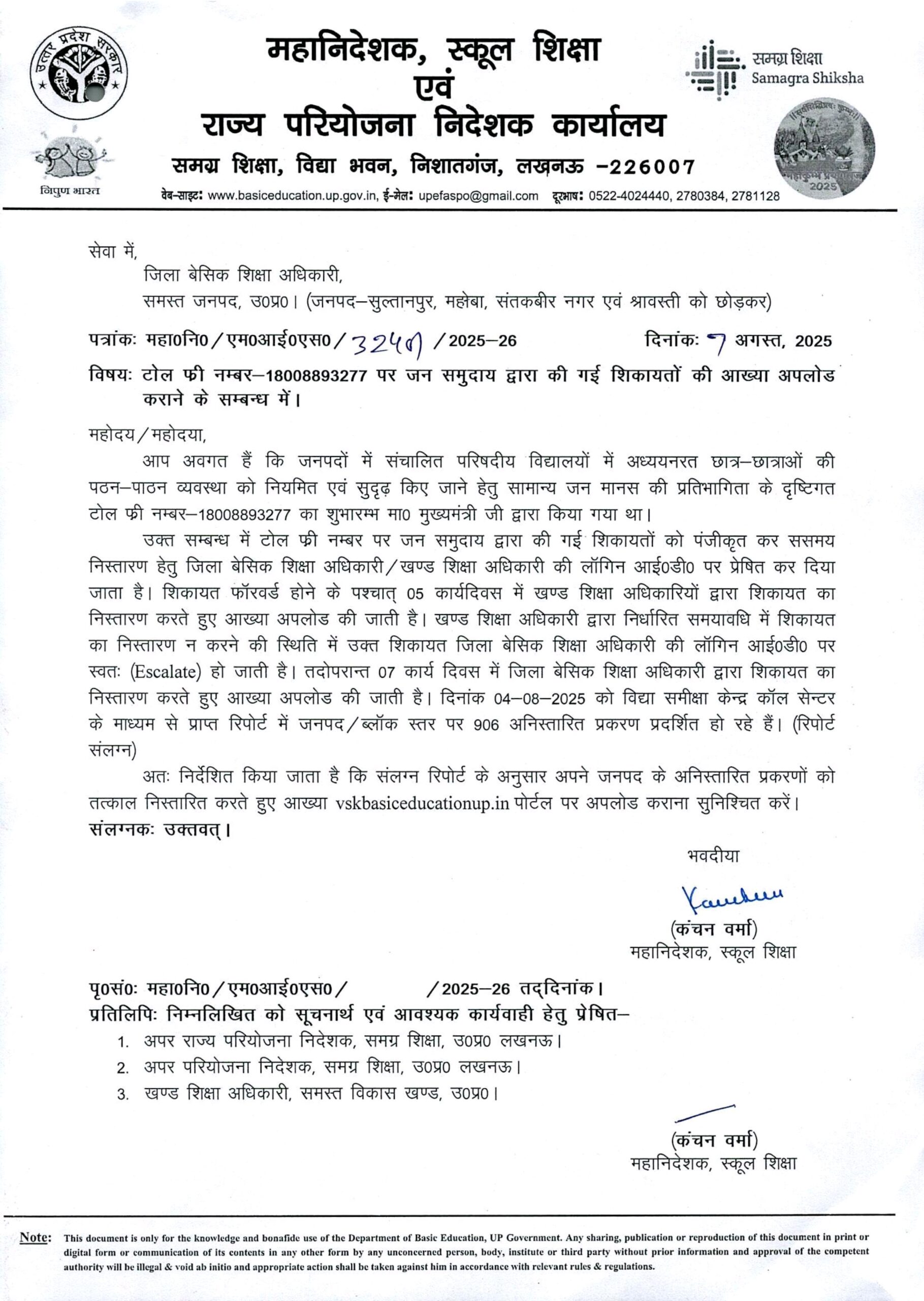 टोल फ्री नम्बर- 18008893277 पर जन समुदाय द्वारा की गई शिकायतों की आख्या अपलोड कराने के सम्बन्ध में।