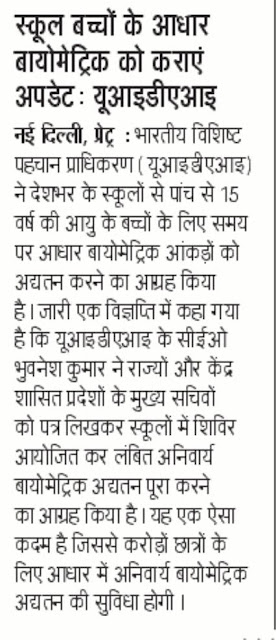 स्कूल बच्चों के आधार बायोमेट्रिक को कराएं अपडेट : यूआइडीएआइ