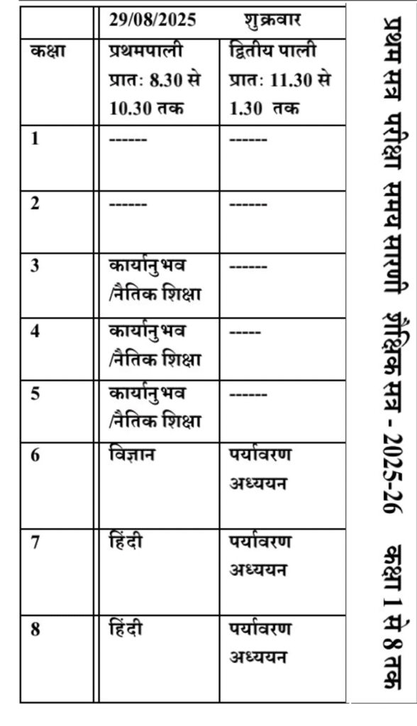 आज की सत्र परीक्षा समय सारिणी : जानिए आज किस कक्षा में होगी कौन से विषयों की परीक्षाएं: 1-8 तक के मॉडल प्रश्न पत्र DOWNLOAD LINK प्रथम सत्र परीक्षा 2025
