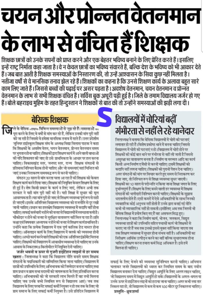 शिक्षक छात्रों को उनके सपनों को प्राप्त करने और एक बेहतर भविष्य बनाने के लिए प्रेरित करते हैं। इसलिए इन्हें राष्ट्र निर्माता कहा जाता है। वे न केवल छात्रों का भविष्य संवारते हैं, बल्कि देश के भविष्य को भी आकार देते हैं। जब बात आती है शिक्षक समस्याओं के निस्तारण की, तो उन्हें आश्वासन के सिवा कुछ नहीं मिलता है। नतीजा वर्षों से वे मानसिक तनाव झेल रहे हैं। शिक्षकों का कहना है कि उनसे शिक्षण कार्य के अलावा बहुत सारे काम लिए जाते हैं। जिससे बच्चों की पढ़ाई पर असर पड़ता है। अवशेष वेतनमान, चयन वेतनमान व प्रोन्नत वेतनमान के लाभ से सभी शिक्षक वंचित हैं। सर्विस बुक अधूरी पड़ी हुई है। जिले के तमाम विद्यालय जर्जर हो गए हैं। बोले बहराइच मुहिम के तहत हिन्दुस्तान ने शिक्षकों से बात की तो उन्होंने समस्याओं की झड़ी लगा