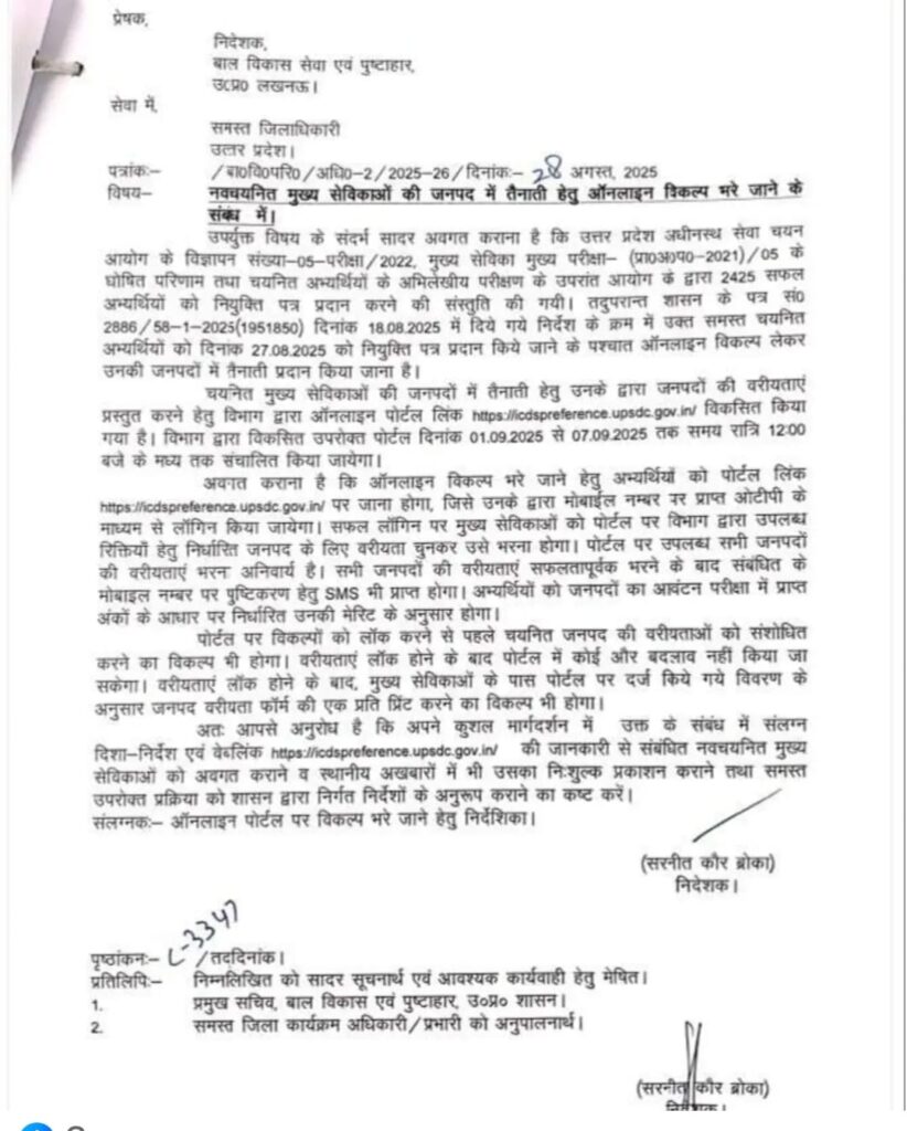 नवचयनित मुख्य सेविकाओं की जनपद में तैनाती हेतु ऑनलाइन विकल्प भरे जाने के संबंध में आदेश जारी✅