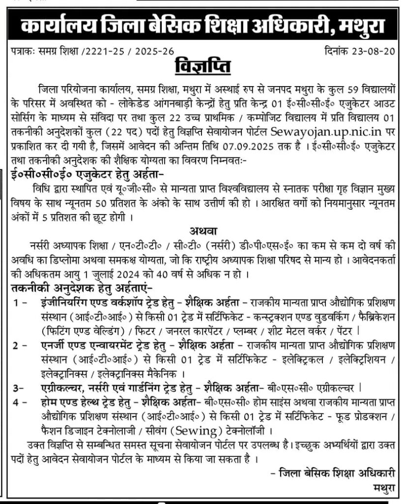 ई०सी०सी०ई० एजुकेटर भर्ती हेतु विज्ञप्ति जारी