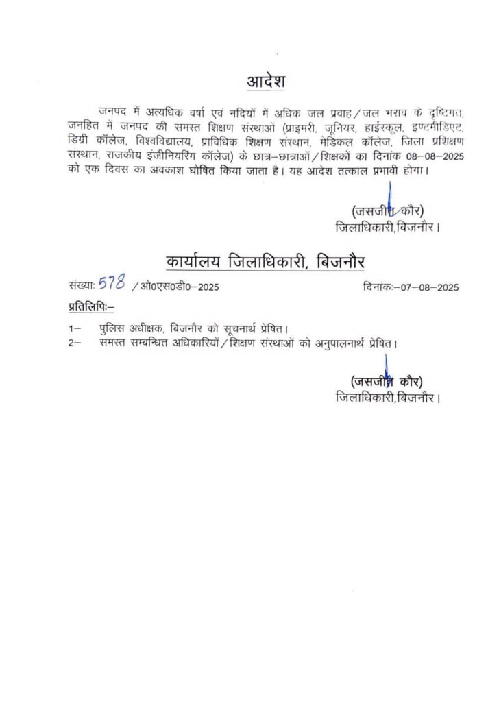 जनपद में अत्यधिक वर्षा एवं नदियों में अधिक जल प्रवाह / जल भराव के दृष्टिगत, जनहित में जनपद की समस्त शिक्षण संस्थाओं (प्राइमरी, जूनियर, हाईस्कूल, इण्टमीडिएट, डिग्री कॉलेज, विश्वविद्यालय, प्राविधिक शिक्षण संस्थान, मेडिकल कॉलेज, जिला प्रशिक्षण संस्थान, राजकीय इंजीनियरिंग कॉलेज) के छात्र-छात्राओं / शिक्षकों का दिनांक 08-08-2025 को एक दिवस का अवकाश घोषित किया जाता है। यह आदेश तत्काल प्रभावी होगा