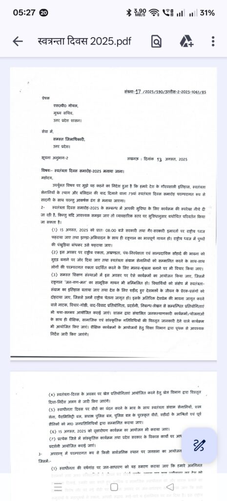 स्वतंत्रता दिवस समारोह-2025 मनाये जाने के सम्बन्ध में शासनादेश जारी, देखें