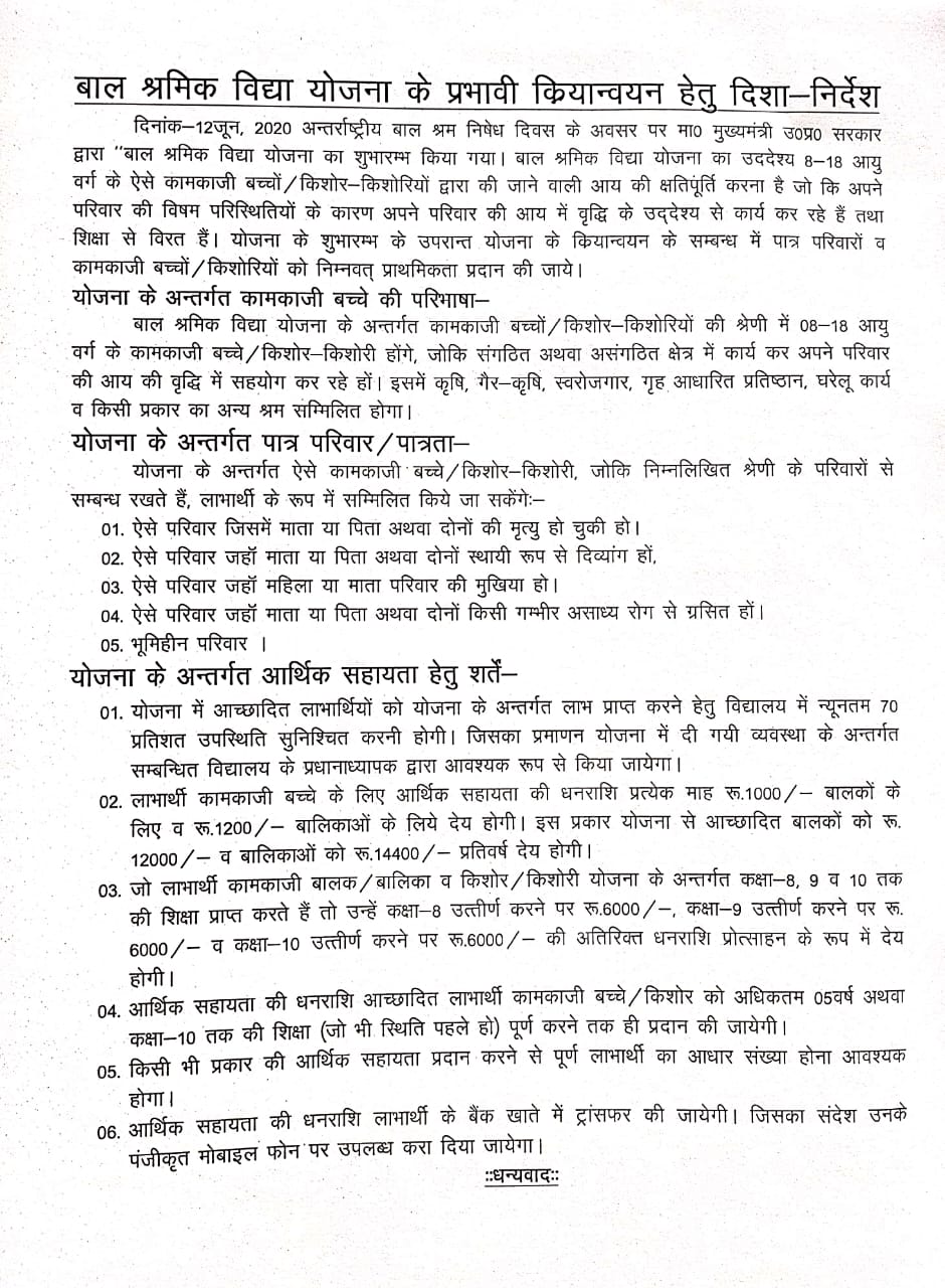 UP : बाल श्रमिक विद्या योजना के प्रभावी क्रियान्वयन हेतु दिशा-निर्देश
