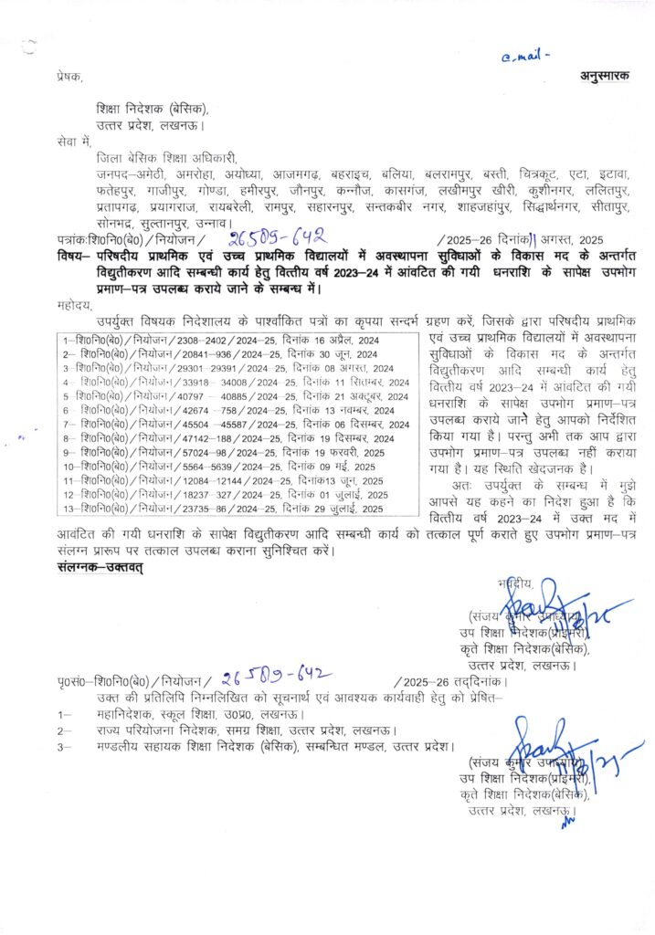 परिषदीय प्राथमिक एवं उच्च प्राथमिक विद्यालयों में अवस्थापना सुविधाओं के विकास मद के अन्तर्गत विद्युतीकरण आदि सम्बन्धी कार्य हेतु वित्तीय वर्ष 2023-24 में आंवटित की गयी धनराशि के सापेक्ष उपभोग प्रमाण-पत्र उपलब्ध कराये जाने के सम्बन्ध में।