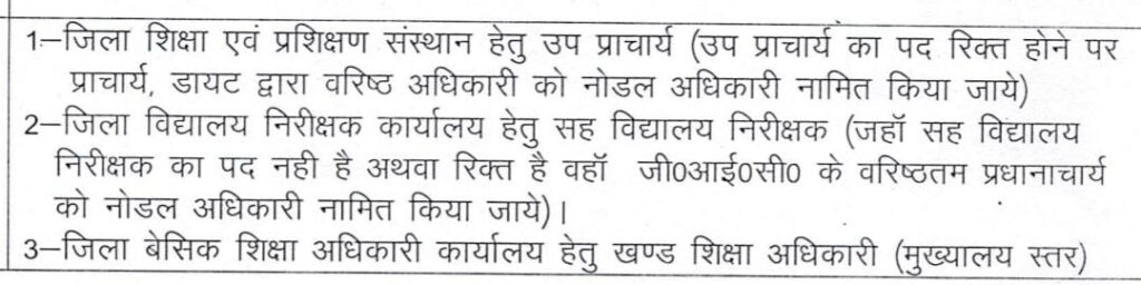 👉 2-माध्यमिक में कार्यरत के लिए- जिला विद्यालय निरीक्षक कार्यालय हेतु सह विद्यालय निरीक्षक (जहाँ सह विद्यालय निरीक्षक का पद नही है अथवा रिक्त है वहाँ जी०आई०सी० के वरिष्ठतम प्रधानाचार्य को नोडल अधिकारी नामित किया जाये)।
