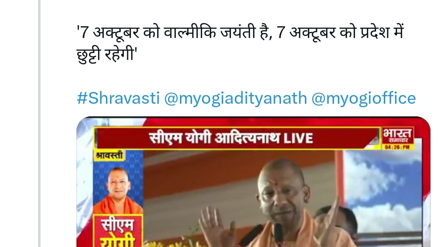 श्रावस्ती में सीएम योगी आदित्यनाथ का बयान…” ‘श्रावस्ती का गौरवशाली इतिहास है, बौद्ध और जैन धर्म का पावन स्थल है’ ‘7 अक्टूबर को वाल्मीकि जयंती है, 7 अक्टूबर को प्रदेश … Continue reading 7 अक्टूबर को वाल्मीकि जयंती पर प्रदेश में रहेगी छुट्टी : योगी