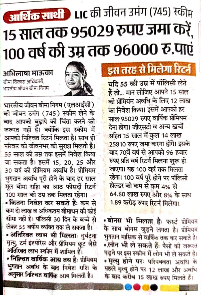 LIC की जीवन उमंग (745) स्कीम 15 साल तक 95029 रुपए जमा करें, 100 वर्ष की उम्र तक 96000 रु. पाएं, इस तरह से मिलेगा रिटर्न