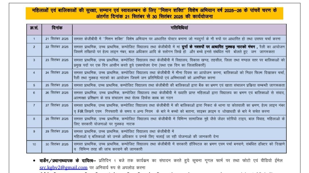 महिलाओं एवं बालिकाओं की सुरक्षा, सम्मान एवं स्वावलम्बन के लिए “मिशन शक्ति” विशेष अभियान वर्ष 2025-26 के पांचवें चरण के अंतर्गत दिनांक 21 सितंबर से 30 सितंबर 2025 की कार्ययोजना