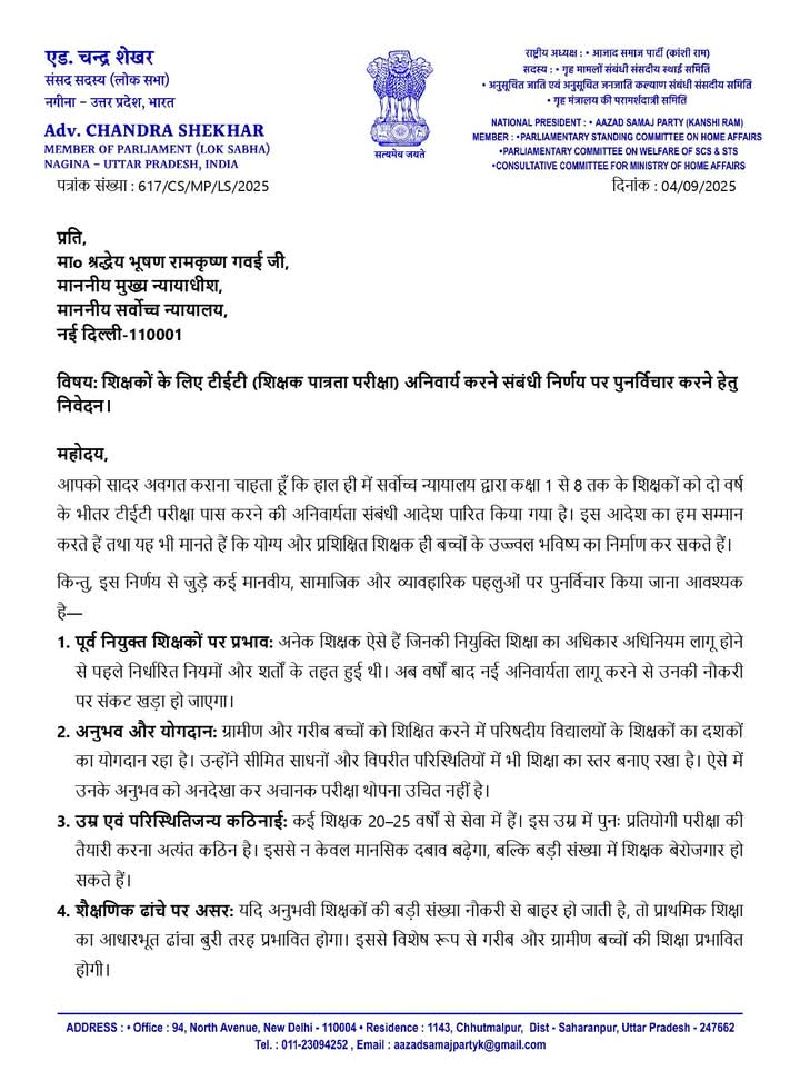 भीम आर्मी के संस्थापक संसद सदस्य चन्द्रशेखर आजाद ने सुप्रीम कोर्ट के चीफ जस्टिस श्री गवई जी को पत्र लिखकर ध्यानाकर्षित करते हुए 2010 से पूर्व नियुक्त शिक्षको को मानवीय आधार पर TET परीक्षा से छूट का अनुरोध करते हुए पत्र लिखा।