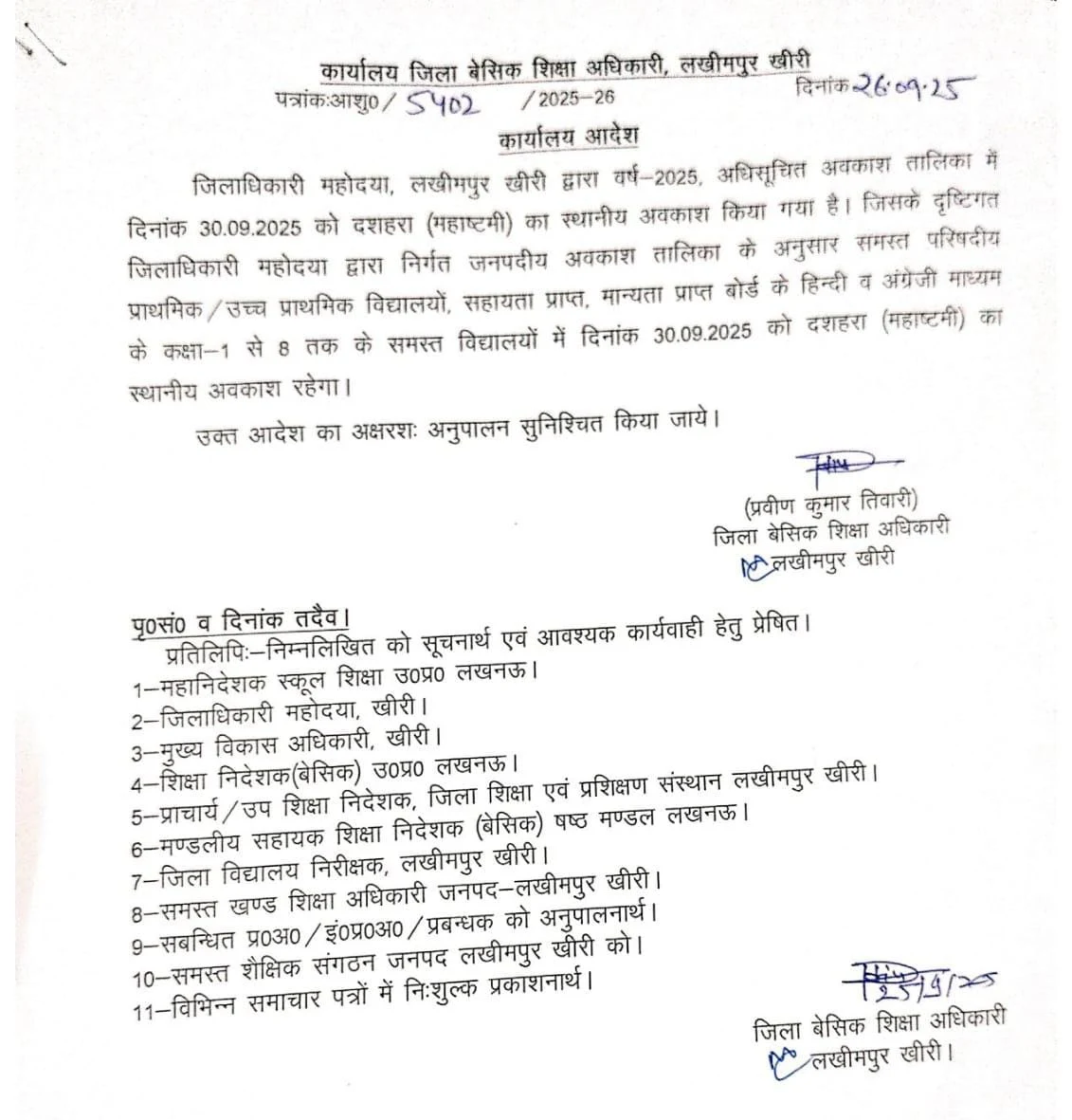 जनपद में 30.09.2025 को दशहरा महाष्टमी अवकाश