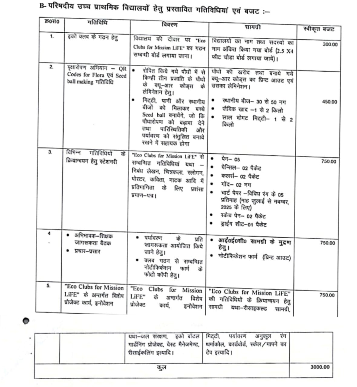 उच्च प्राथमिक विद्यालय हेतु इको क्लब गतिविधियां एवं बजट