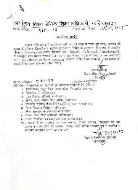 जनपद में अत्यधिक भारी वर्षा के कारण 3 सितंबर का स्कूलों में अवकाश किया गया घोषित