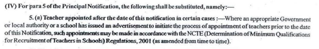 आरटीआई एक्ट 2009 के सेक्शन 23(2) का सहारा लेते हुए न्यायालय ने ये कहा है कि ऐसे शिक्षक जो कि एक्ट लागू होने पर न्यूनतम अहर्ता यानी टीईटी उत्तीर्ण नहीं थे उन्हें 05 वर्षों के भीतर टीईटी करना होगा । ये मामला तमिलनाडु सरकार का था जहां पर तमिलनाडु सरकार ने केंद्र सरकार की अनुमति से ऐसी नियुक्तियां की थी जिनमें अभ्यर्थियों को टीईटी से छूट दी गई थी फिर केंद्र सरकार ने 2017 में इस पर clearification दिया कि टीईटी करना होगा । यहां बात का उल्लेख करना अति – आवश्यक है कि केंद्र सरकार स्वयं टीईटी से छूट की अनुमति नहीं दे सकती है । पर 2015 में तमिलनाडु राज्य के लिए इस समय सीमा को बढ़ाकर 2019 किया ।