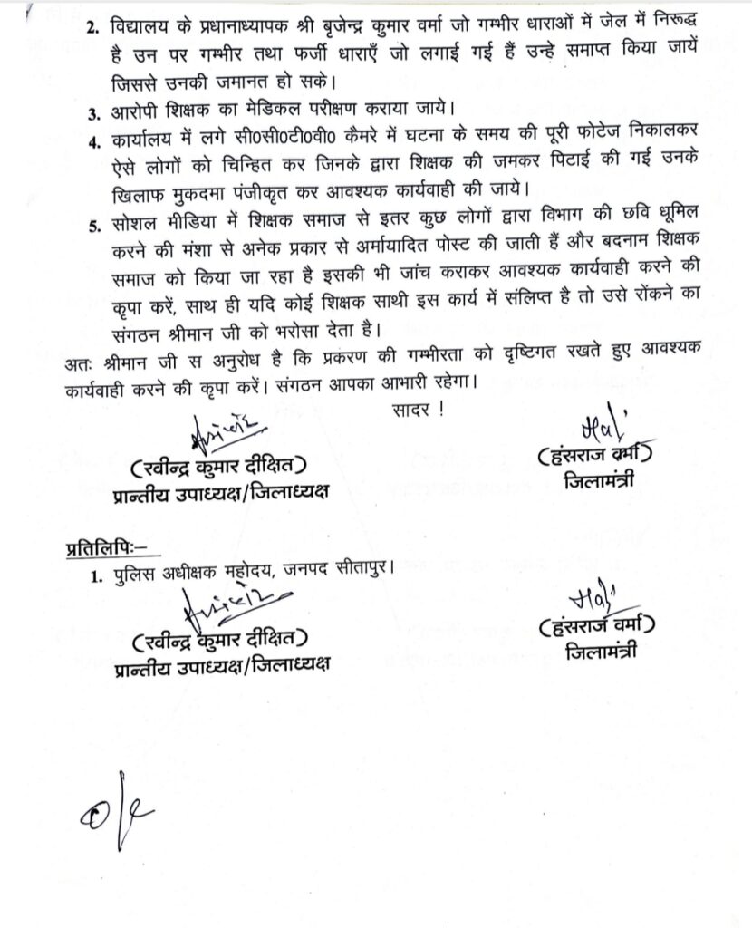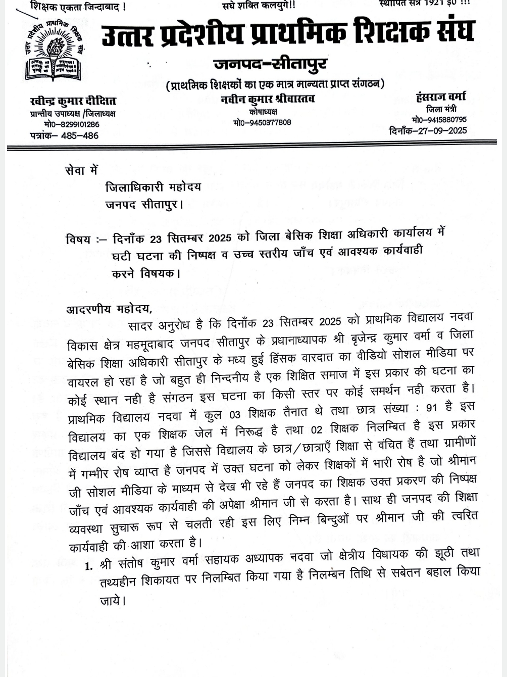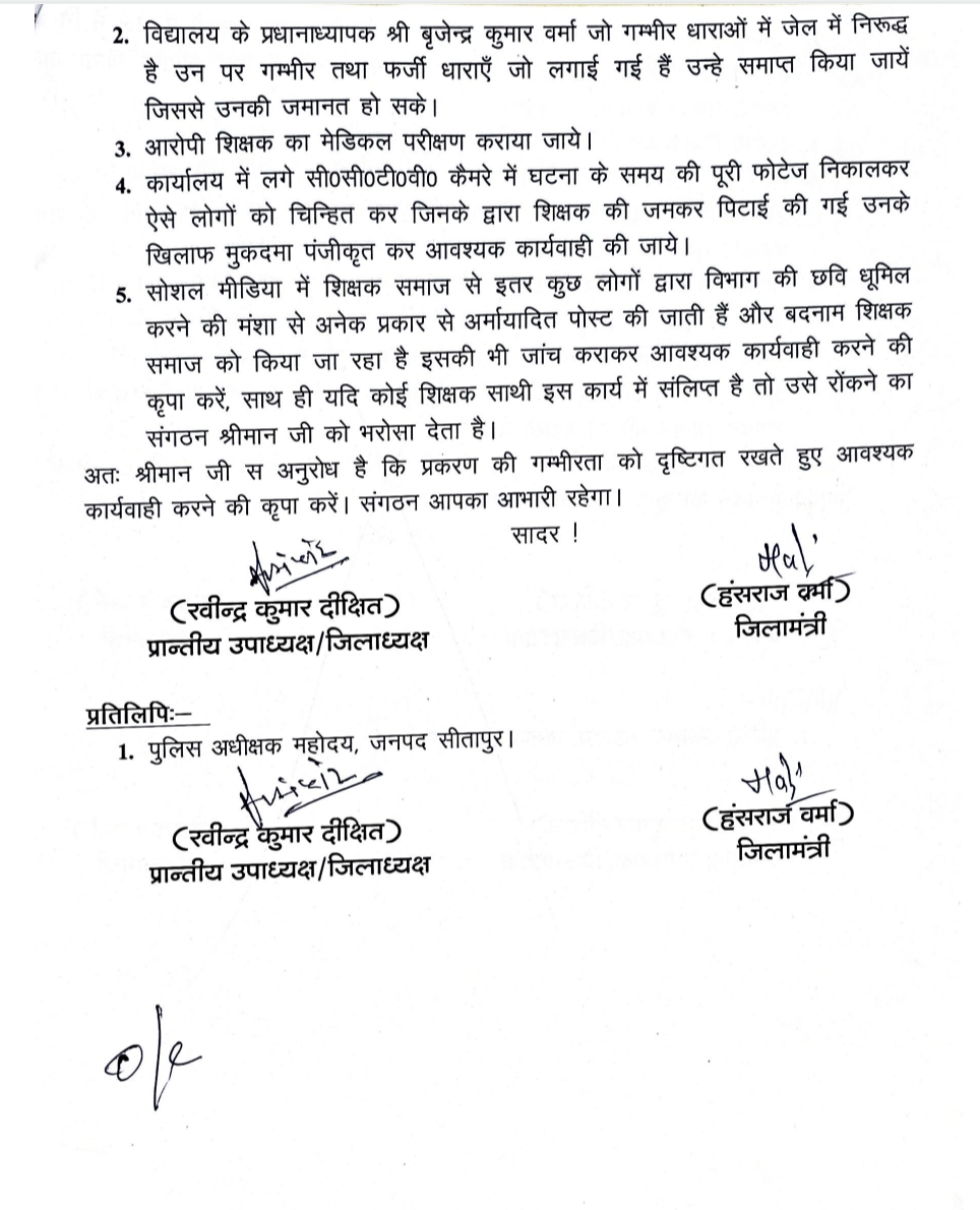 सादर अनुरोध है कि दिनाँक 23 सितम्बर 2025 को प्राथमिक विद्यालय नदवा विकास क्षेत्र महमूदाबाद जनपद सीतापुर के प्रधानाध्यापक श्री बृजेन्द्र कुमार वर्मा व जिला बेसिक शिक्षा अधिकारी सीतापुर के मध्य हुई हिंसक वारदात का वीडियो सोशल मीडिया पर वायरल हो रहा है जो बहुत ही निन्दनीय है एक शिक्षित समाज में इस प्रकार की घटना का कोई स्थान नही है संगठन इस घटना का किसी स्तर पर कोई समर्थन नही करता है। प्राथमिक विद्यालय नदवा में कुल 03 शिक्षक तैनात थे तथा छात्र संख्या: 91 है इस विद्यालय का एक शिक्षक जेल में निरूद्ध है तथा 02 शिक्षक निलम्बित है इस प्रकार विद्यालय बंद हो गया है जिससे विद्यालय के छात्र/छात्राएँ शिक्षा से वंचित हैं तथा ग्रामीणों में गम्भीर रोष व्याप्त है जनपद में उक्त घटना को लेकर शिक्षकों में भारी रोष है जो श्रीमान जी सोशल मीडिया के माध्यम से देख भी रहे हैं जनपद का शिक्षक उक्त प्रकरण की निष्पक्ष जाँच एवं आवश्यक कार्यवाही की अपेक्षा श्रीमान जी से करता है। साथ ही जनपद की शिक्षा व्यवस्था सुचारू रूप से चलती रही इस लिए निम्न बिन्दुओं पर श्रीमान जी की त्वरित कार्यवाही की आशा करता है।
