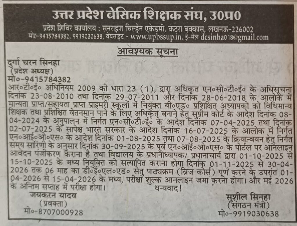 बी एड योग्यताधारी शिक्षकगण के ब्रिज कोर्स कराने के संबंध में आवश्यक सूचना